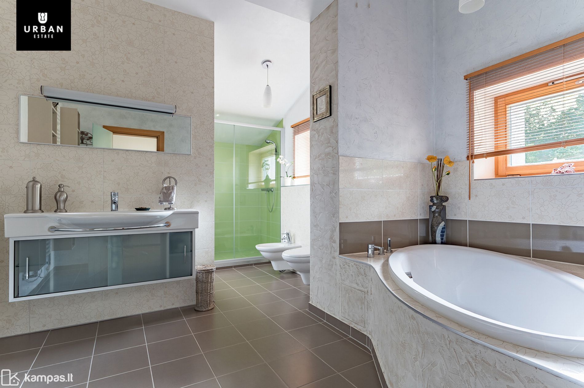 • Grindys - medinis ąžuolo parketas, plytelės;