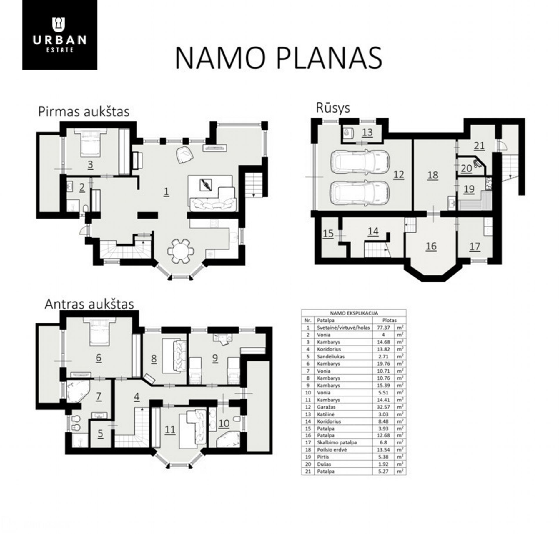 • Rūsyje įrengtas dvivietis garažas su elektromobilių įkrovimo stotele. Taip pat čia rasite ir pirties bei poilsio erdves, skalbimo bei pagalbines patalpas.