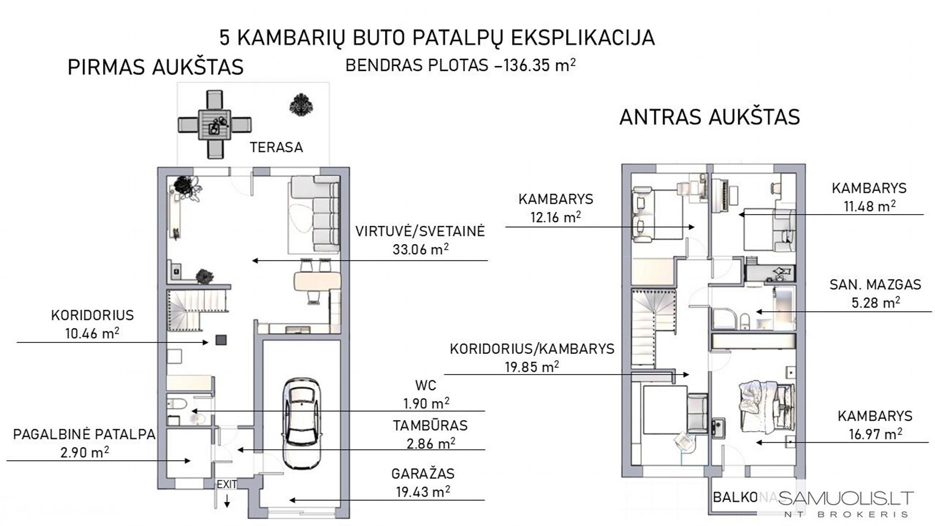 • 2 aukštai, 136 kv. m. erdvės patogiam gyvenimui;