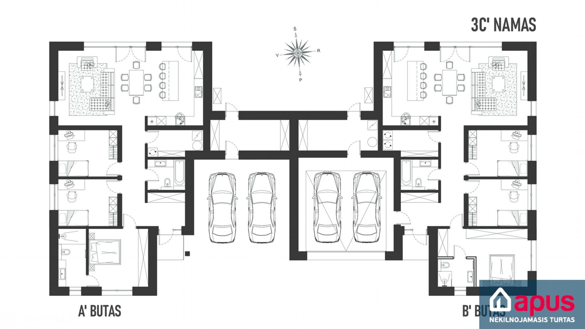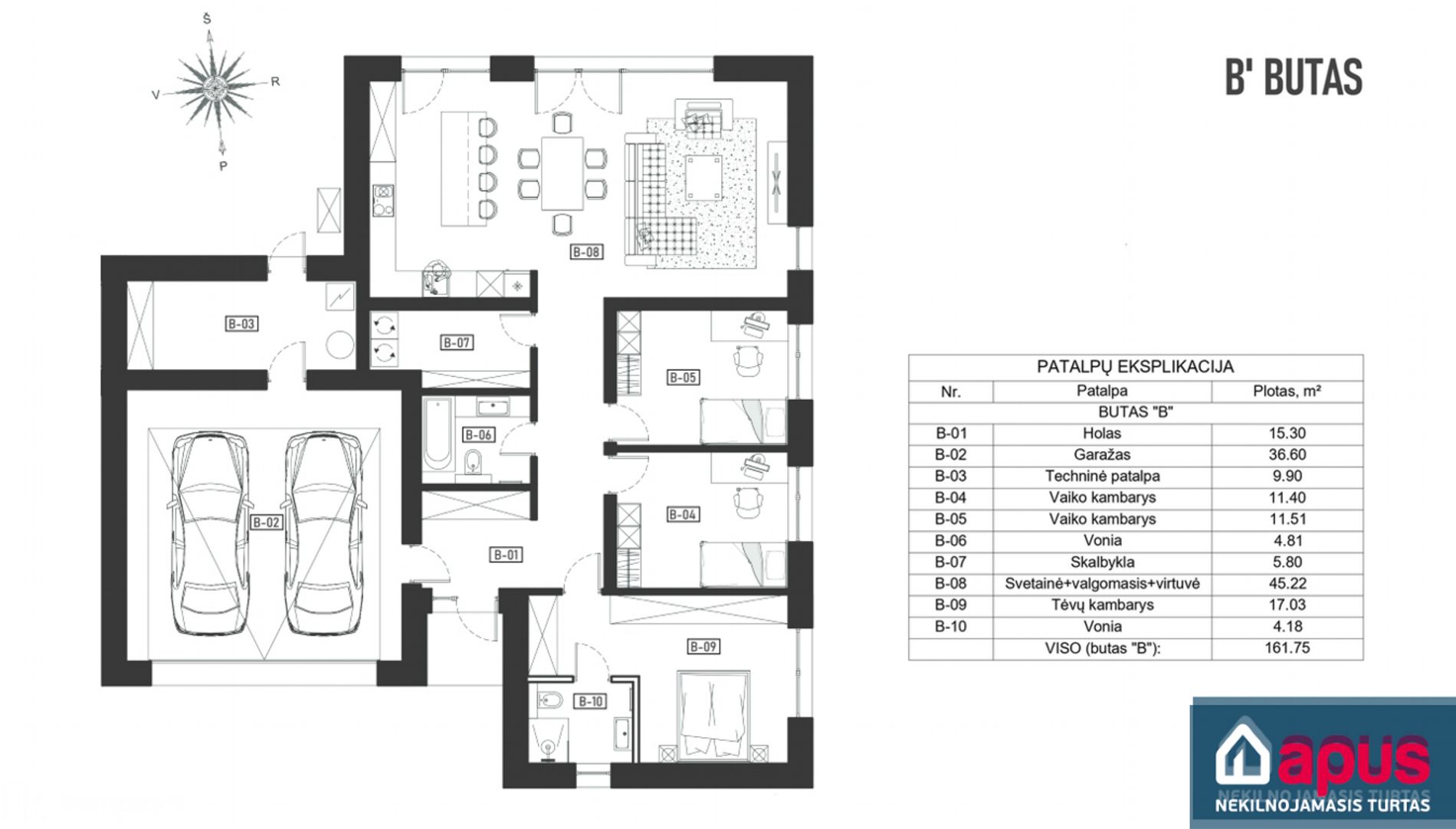 • 4 kambariai, 2 san. mazgai, drabužinės, sandėliukai bei garažai 1 arba 2 automobiliams.