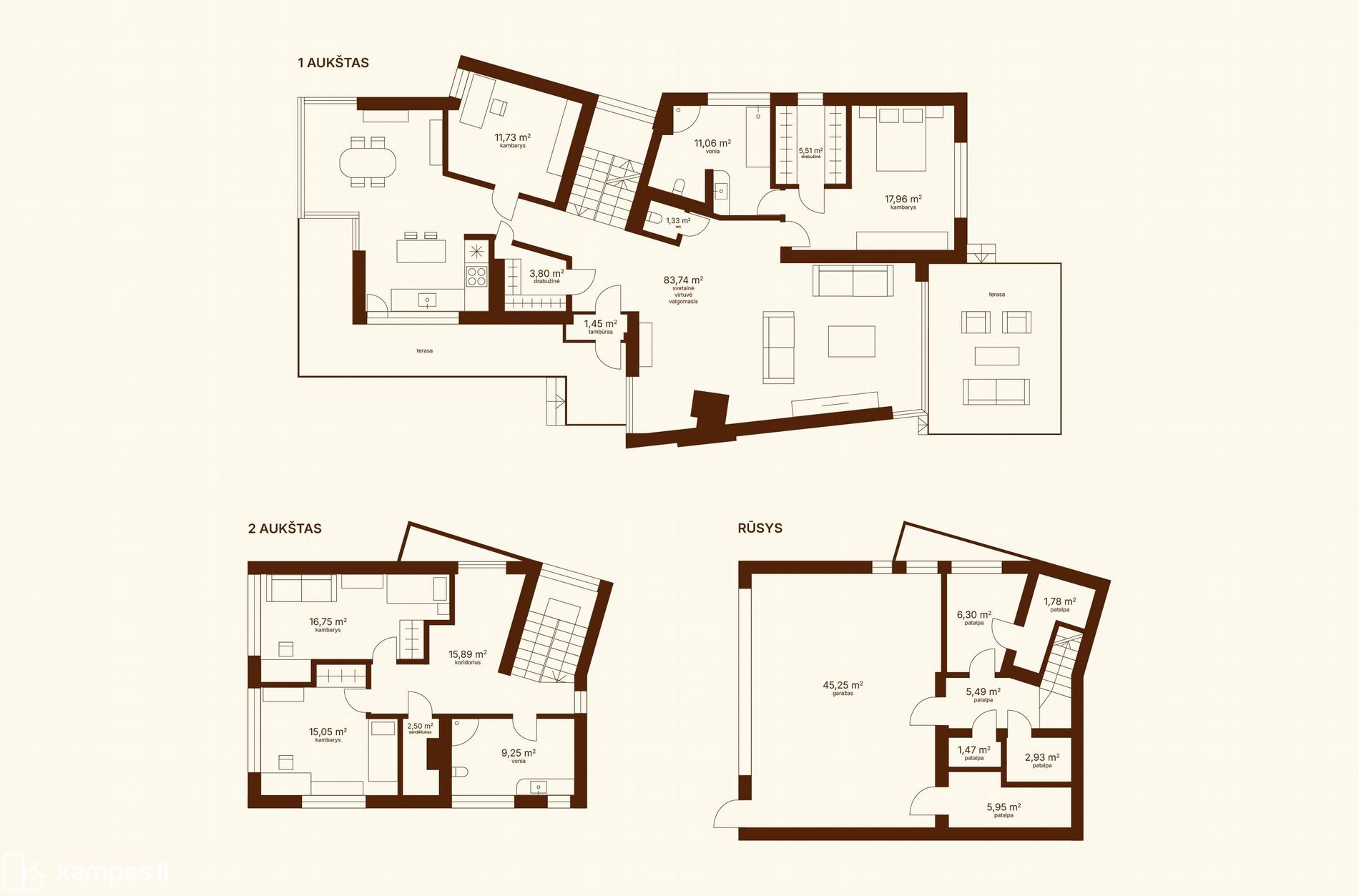Pirmame namo aukšte didelė svetainės erdvė su vitrininiais langais į kiemą ir stumdomomis durimis į terasą - tai bus Jūsų pagrindinis džiaugsmas šiltuoju sezonu. Taip pat suplanuota šviesi, patogi virtuvė su valgomojo zona, darbo kambarys, drabužinė ir svečių WC. Šiame aukšte ir pagrindinis miegamasis su privačiu vonios kambariu (įrengta vonia ir dušo kabina) ir įeinama drabužine.