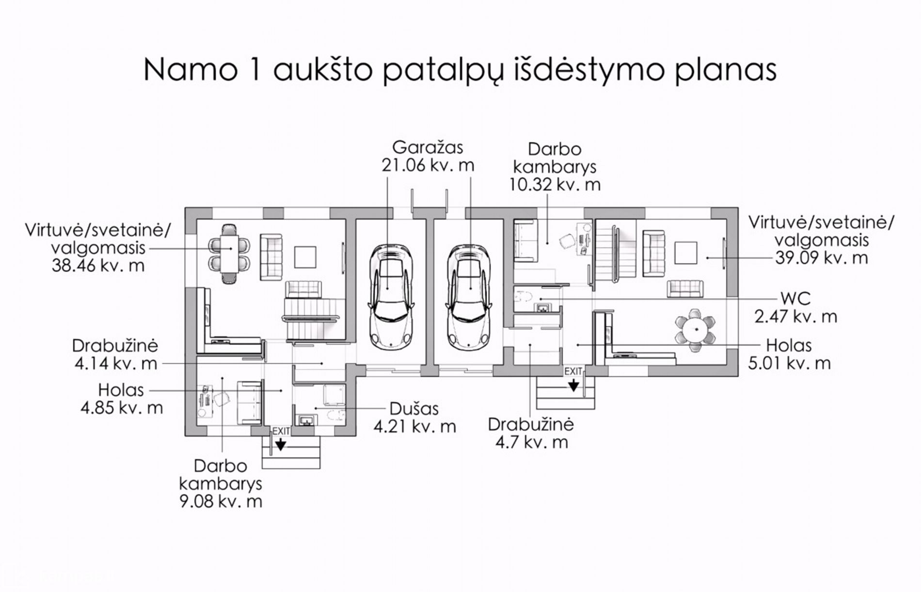 • Kambarių skaičius - 5, virtuvė sujungta su svetainės ir valgomojo zona, darbo kambarys, 3 miegamieji kambariai.