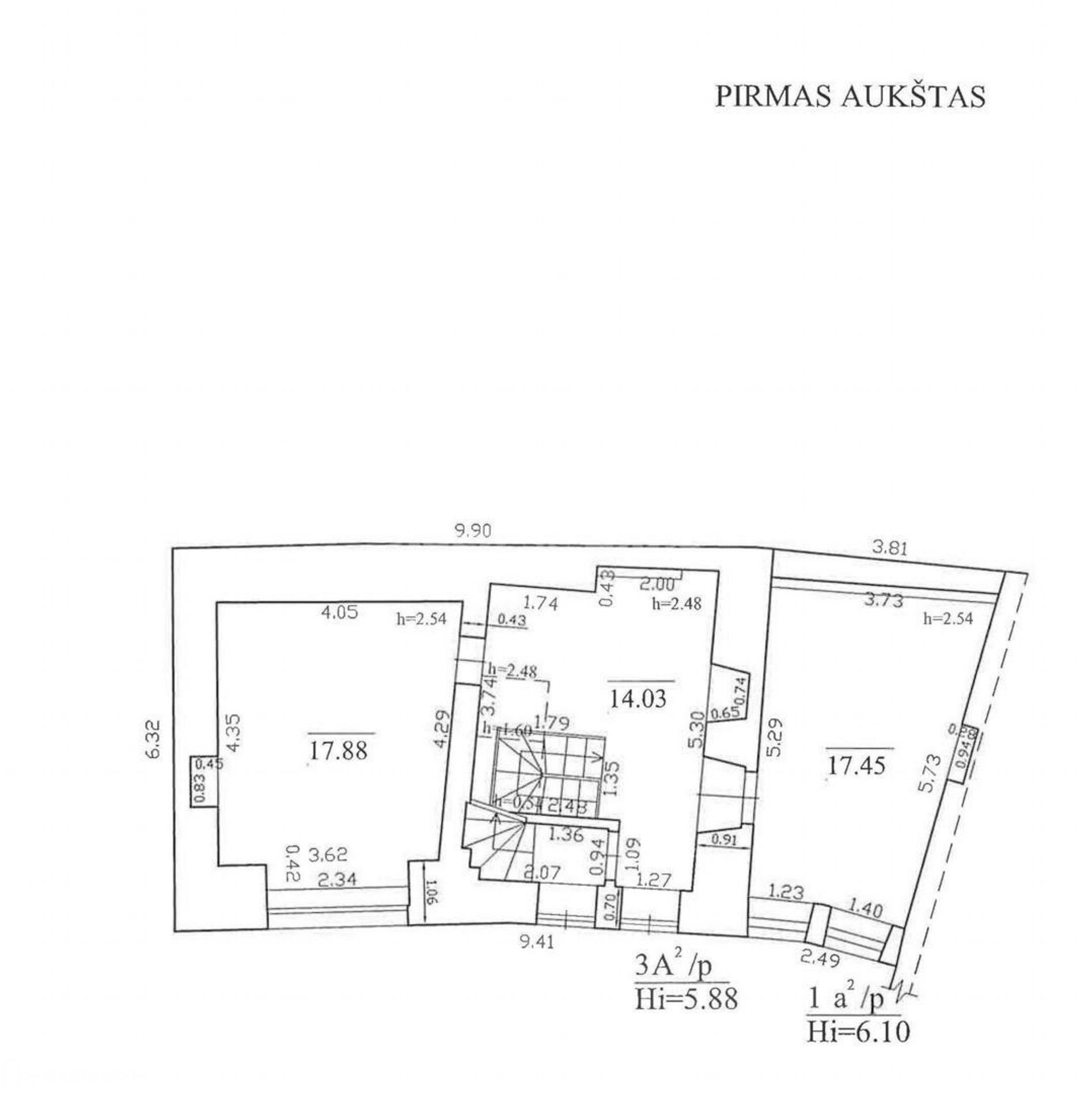 Pirmas aukštas (49.36 m²): • Kambarys – 17.88 m² • Įėjimo holas – 14.03 m² • Kambarys – 17.45 m²