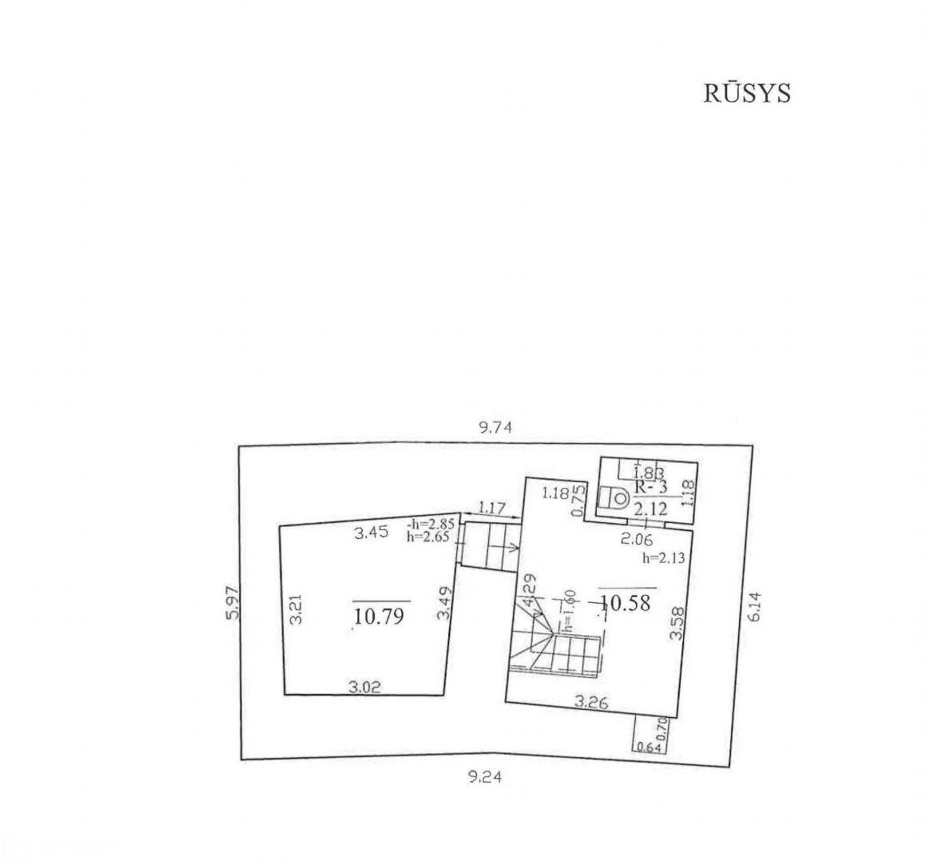 Rūsys (23.49 m²): • Patalpa – 10.79 m² • Patalpa – 10.58 m² • San. mazgas – 2.12 m²