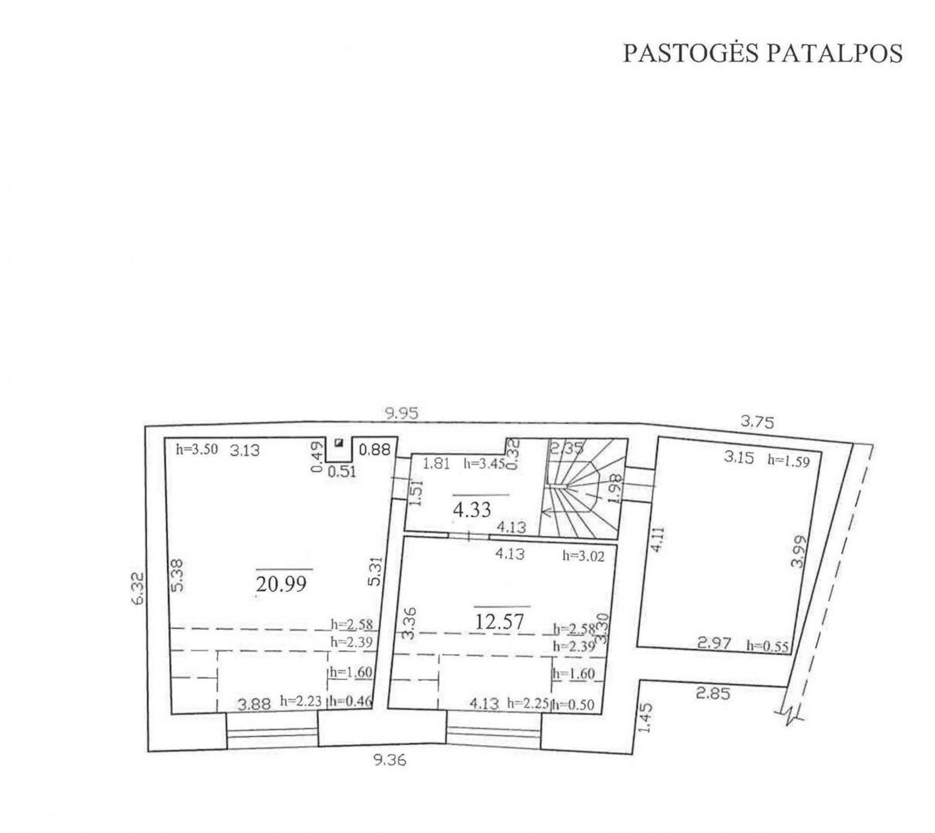 Mansardos aukštas (37.89 m²): • Kambarys – 20.99 m² • Kambarys – 12.57 m² • Holas – 4.33 m²