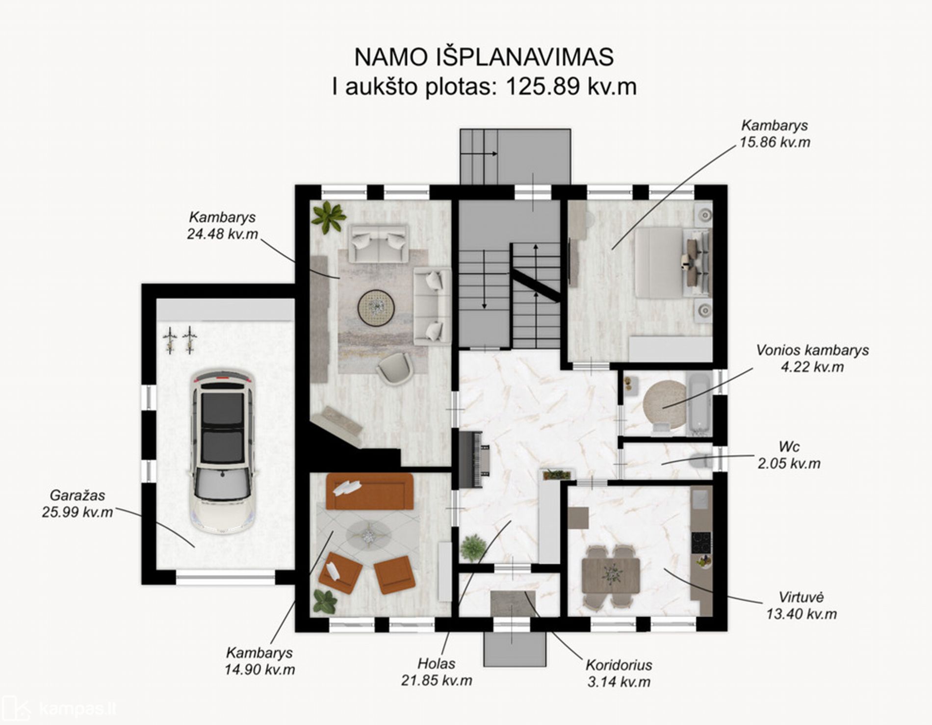 • I aukštas - holas, svetainė, 2 kambariai, virtuvė, vonios kambarys ir WC;