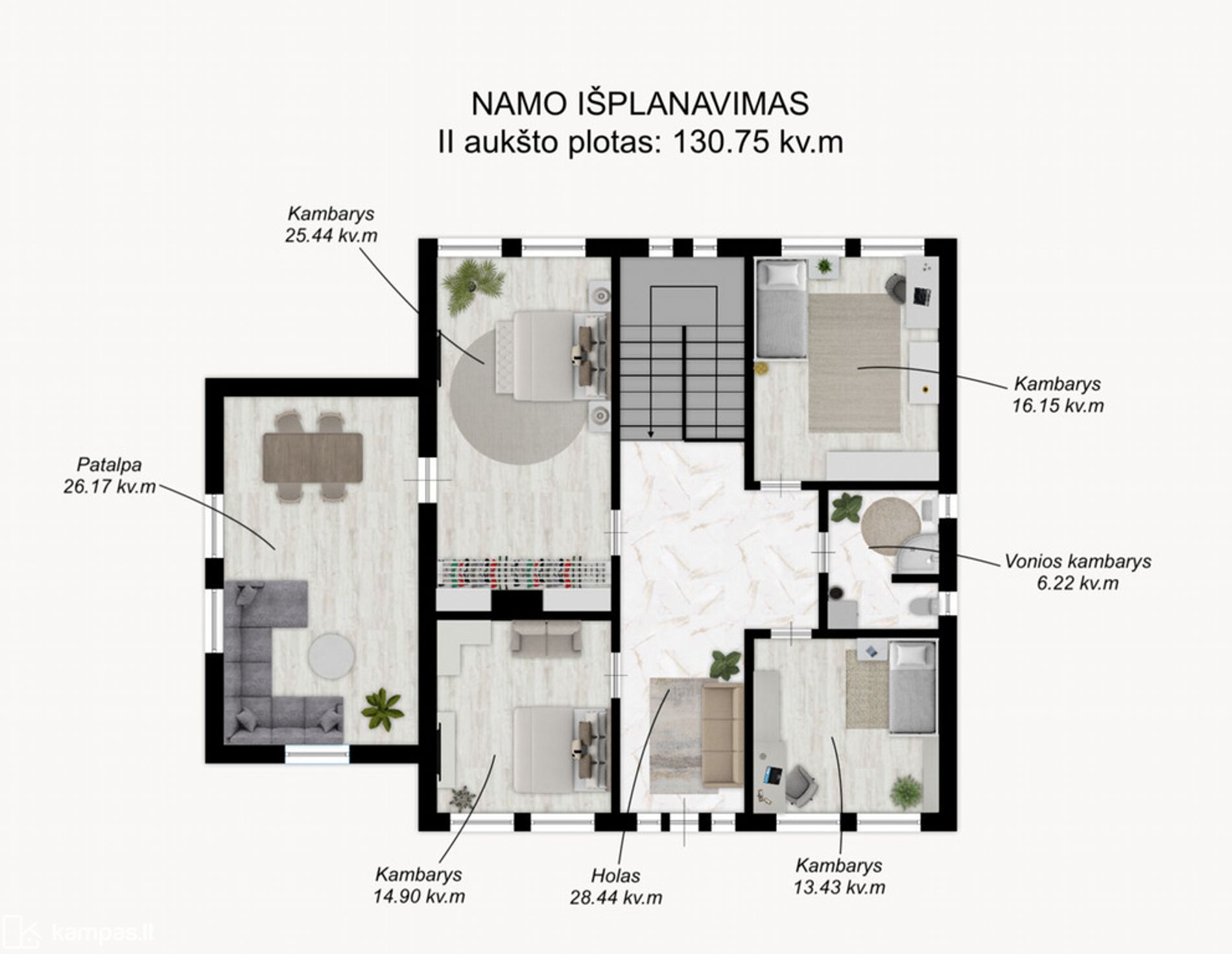 • II aukštas - holas, 4 kambariai ir vonios kambarys;