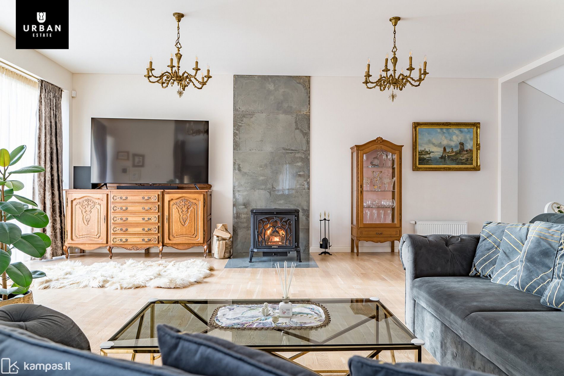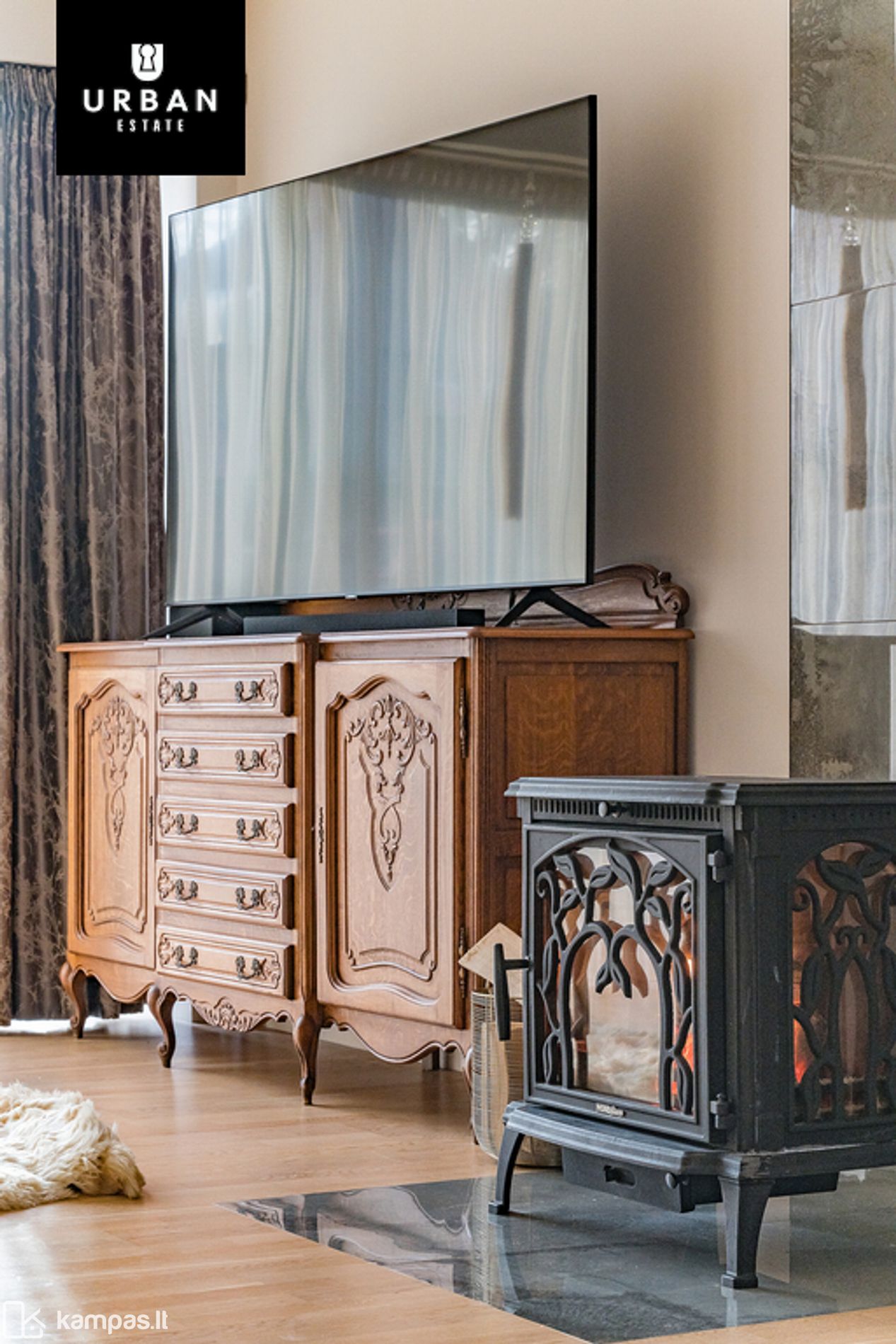 Svetainėje įrengtas židinys;