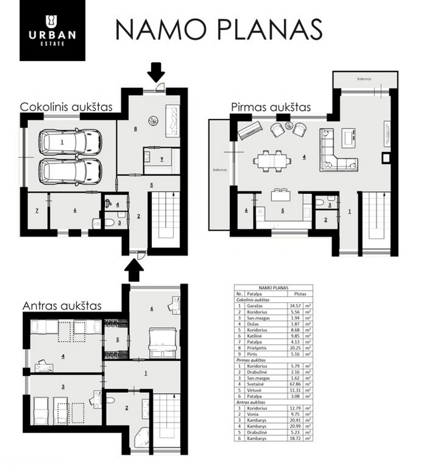 - Namus visuomet išlaikysite tvarkingus bei gaivius - įrengtos erdvios drabužinės, sieninės spintos, daug vietos cokoliniame aukšte ir sezoniniams daiktams: katilinė, dvigubas garažas, pagalbinės patalpos.