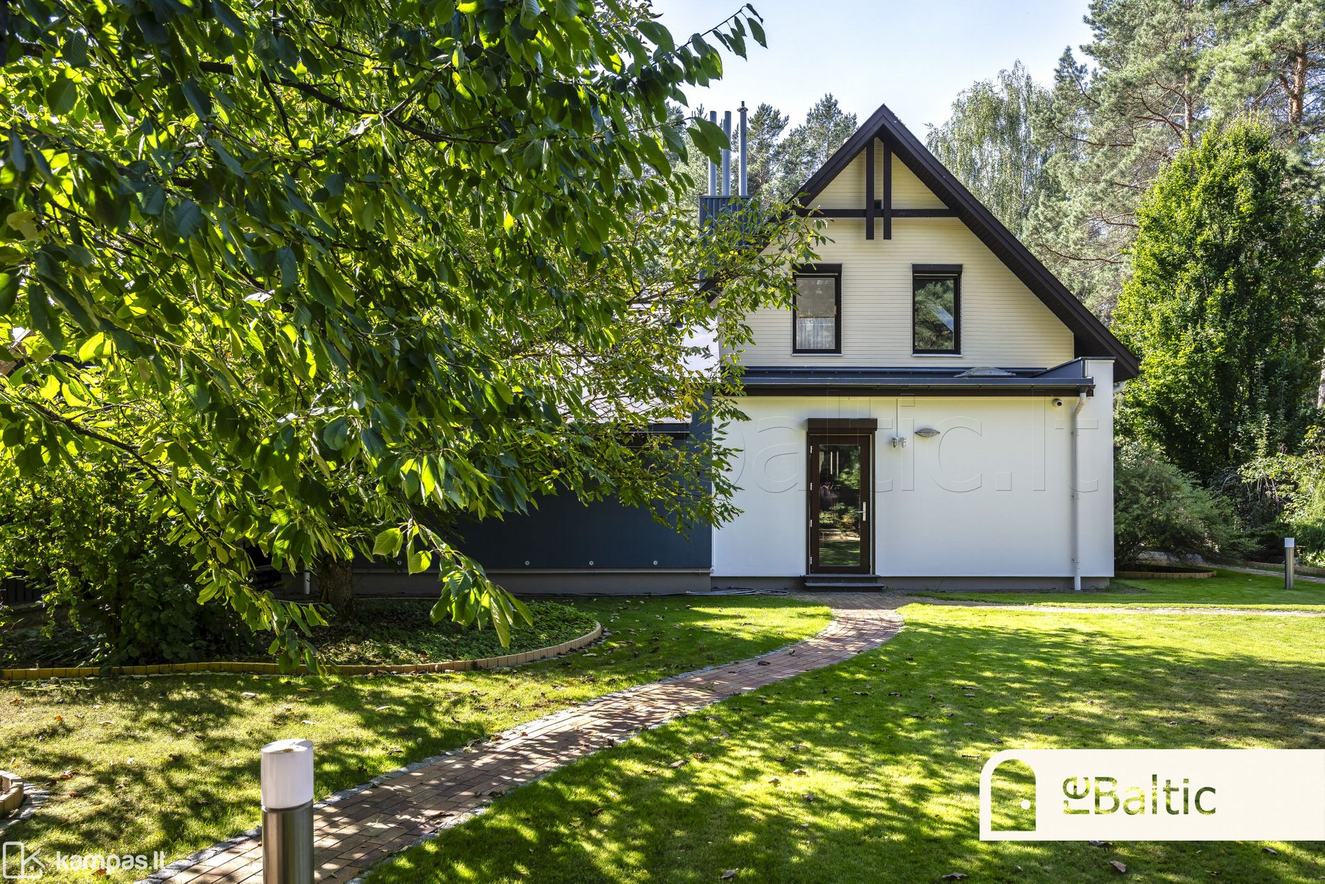 Vaizdo stebėjimo sistema, apsauginės žaliuzės ant fasado langų. Kieme – lauko baldai, terasa, rami kaimynystė.