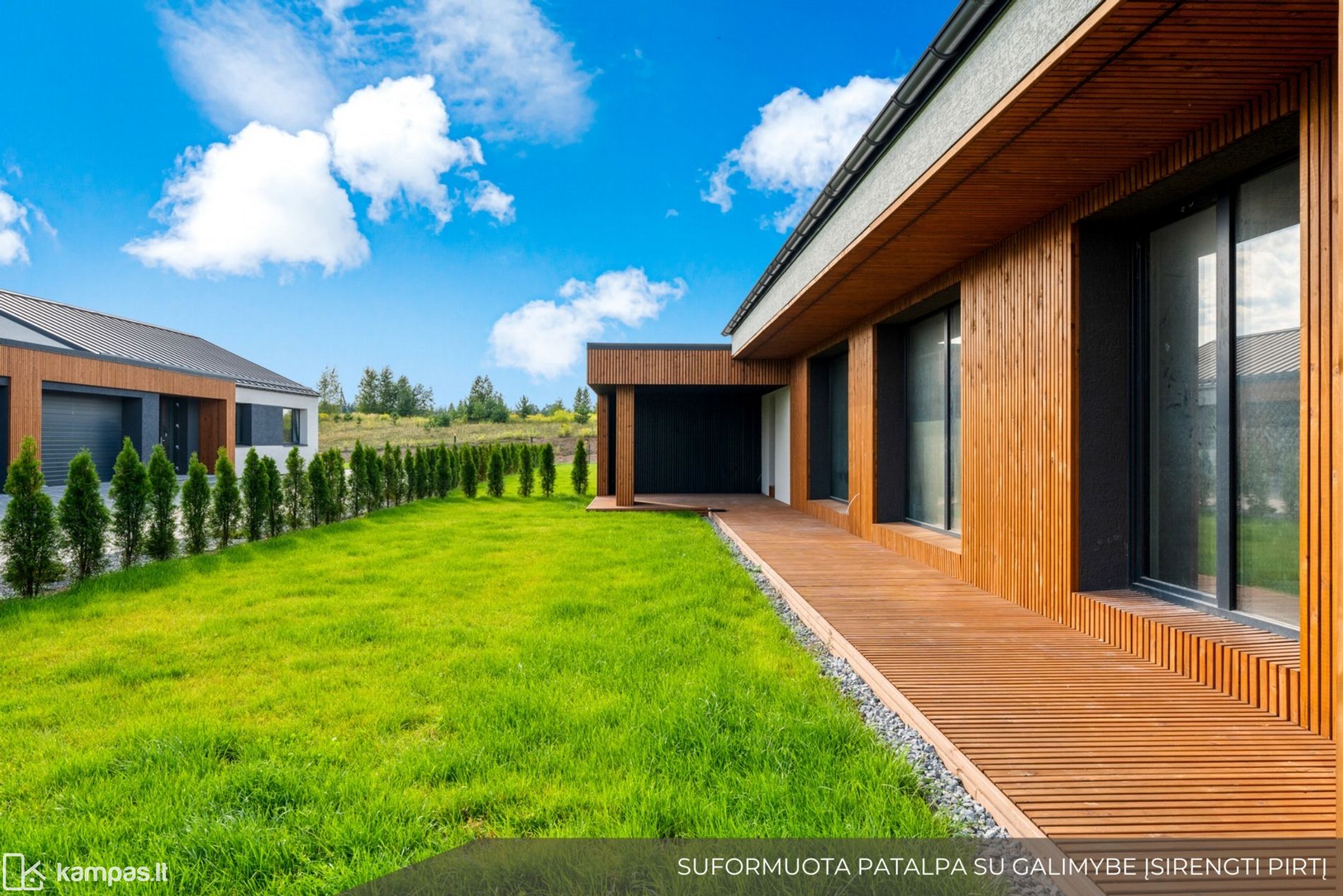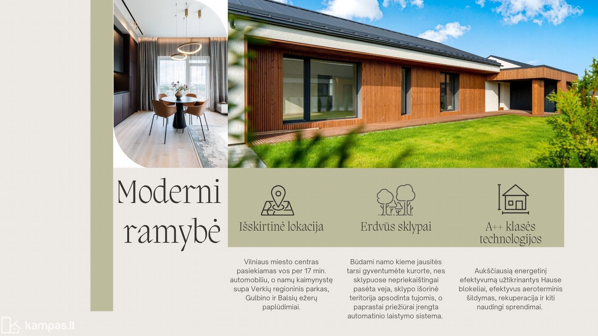 Šiame projekte, nutolusiame vos 10 km nuo Vilniaus centro, atrasite svajonių namų charakteristikas atitinkančius sprendimus - funkcionalus patalpų išdėstymas viename aukšte su daugiau nei 4 m siekiančiomis lubomis svetainės zonoje, dideli langai nuo grindų apačios, erdvi terasa, garažas ir net iki smulkmenų apželdintas 7,6 aro sklypas su automatinio laistymo sistema. Šie sprendimai sukuria išskirtinį gyvenimo komfortą, kurį jausite tiek būdami namo viduje, tiek leisdami laiką su šeima lauke.