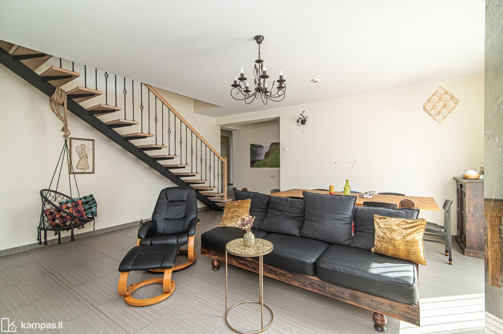 Erdvų svetainės-valgomojo kambarį (36,5 m2) puošia modernus dekoruotas akmens apdaila židinys. Šalia - pilnai įrengta virtuvė (14,98 m2) su sala ir integruota buitine technika.