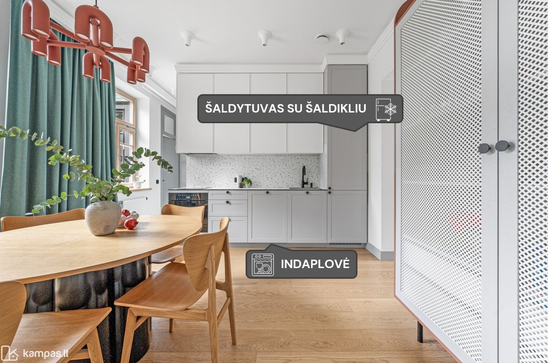 • Parduodama su integruotais kokybiškais baldais (individualus virtuvės komplektas, sumontuotos sieninės spintos, individualūs vonios baldai, svetainės ir miegamųjų kambarių baldai) ir kokybiška buitine technika - virtuvės buitinė technika (orkaite, kaitlente, gartraukiu, indaplove, šaldytuvu).