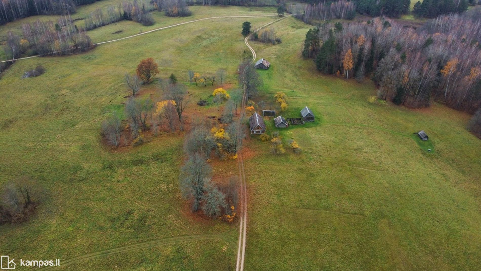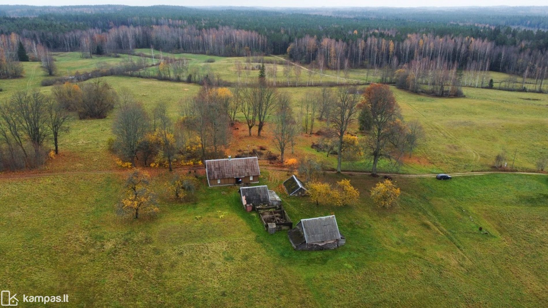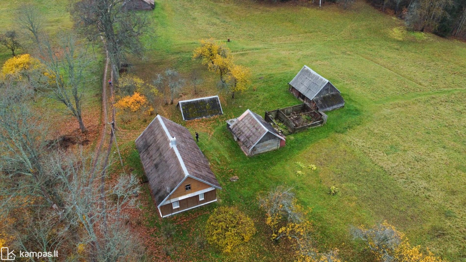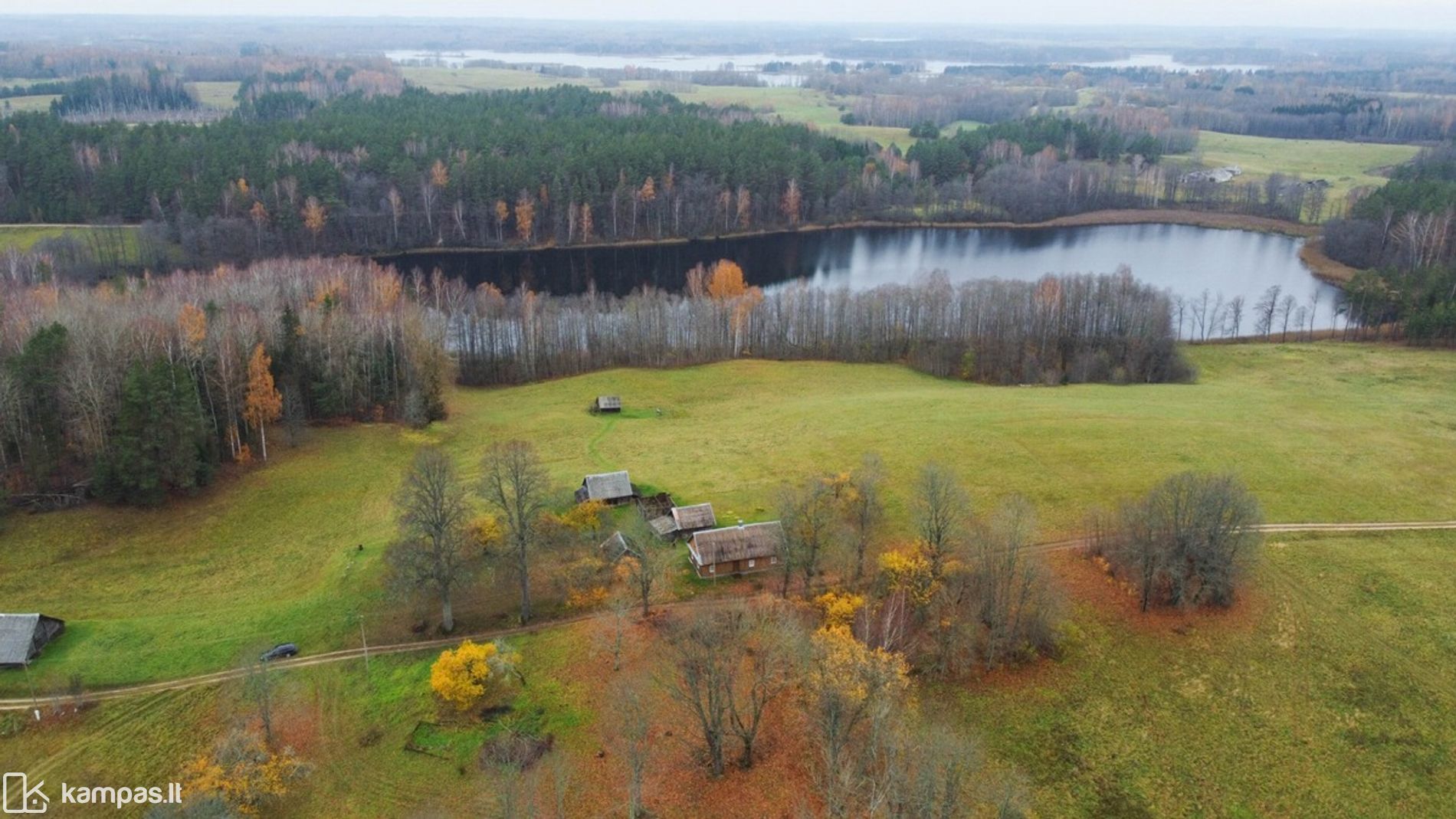 Sodybos namas ant kalvos, gražaus vaizdo perspektyvos atsiveria į visas puses, kieme senoviniai klojimas su svirnu, tolėliau ežero link, pirtis.