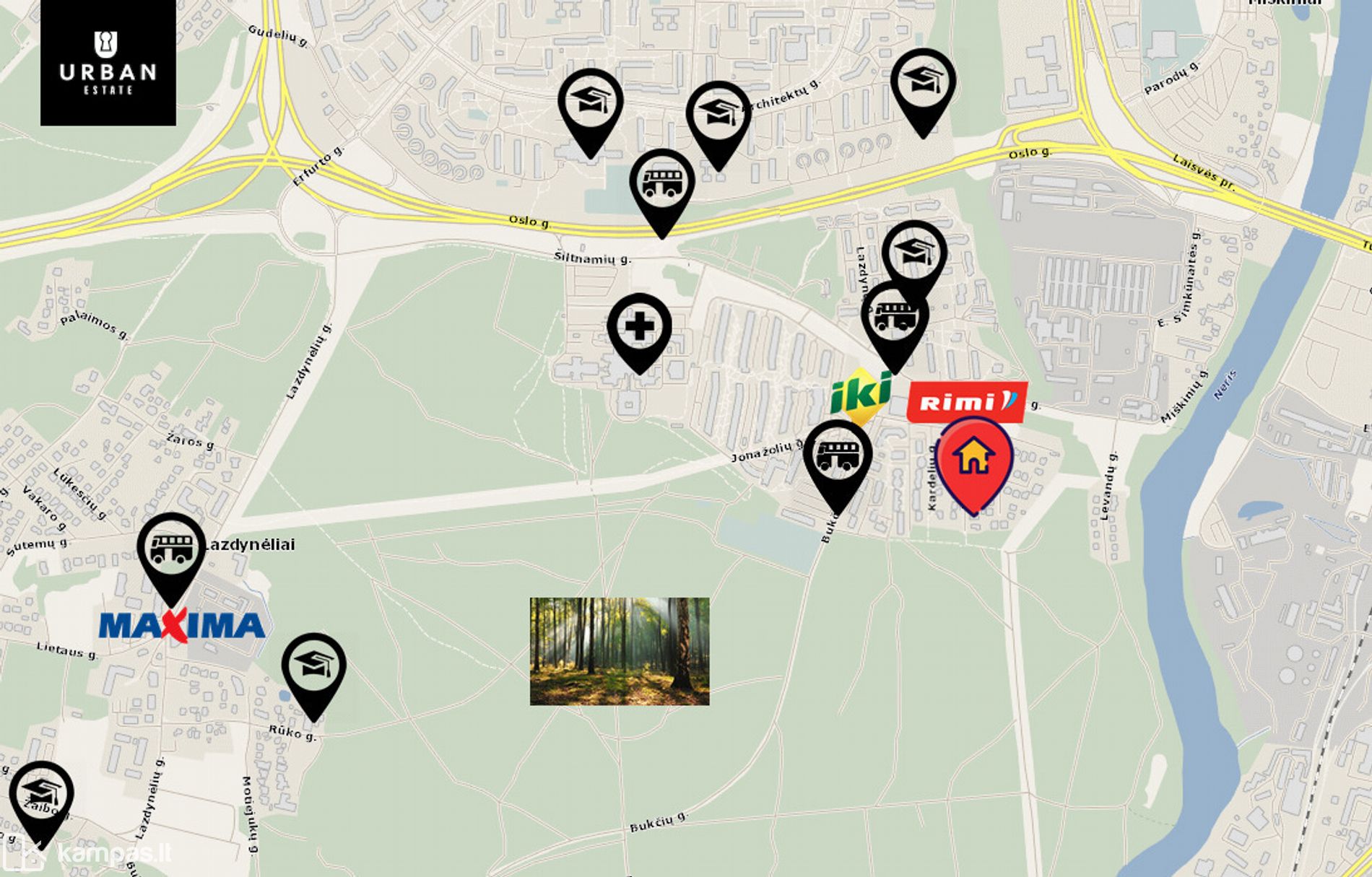 - Namas yra atokioje itin žalioje miesto vietoje, kuri ribojasi su Bukiškio mišku. Namas gatvės pabaigoje, todėl nejusite jokio gatvės šurmulio. Kvartalas išasfaltuotas, apšviestas su solidžia kaimynyste.
