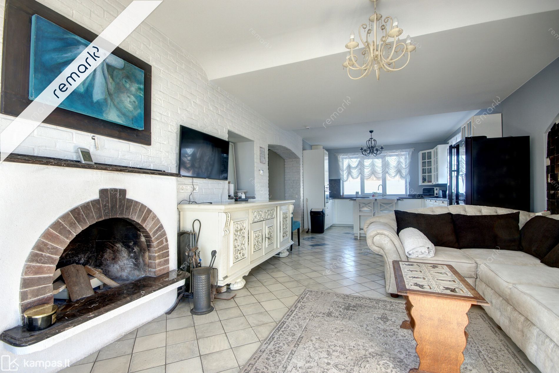 - Virtuvė kartu su svetaine: Staliukas, stalas, kėdės, sofa, komoda, TV, židinys