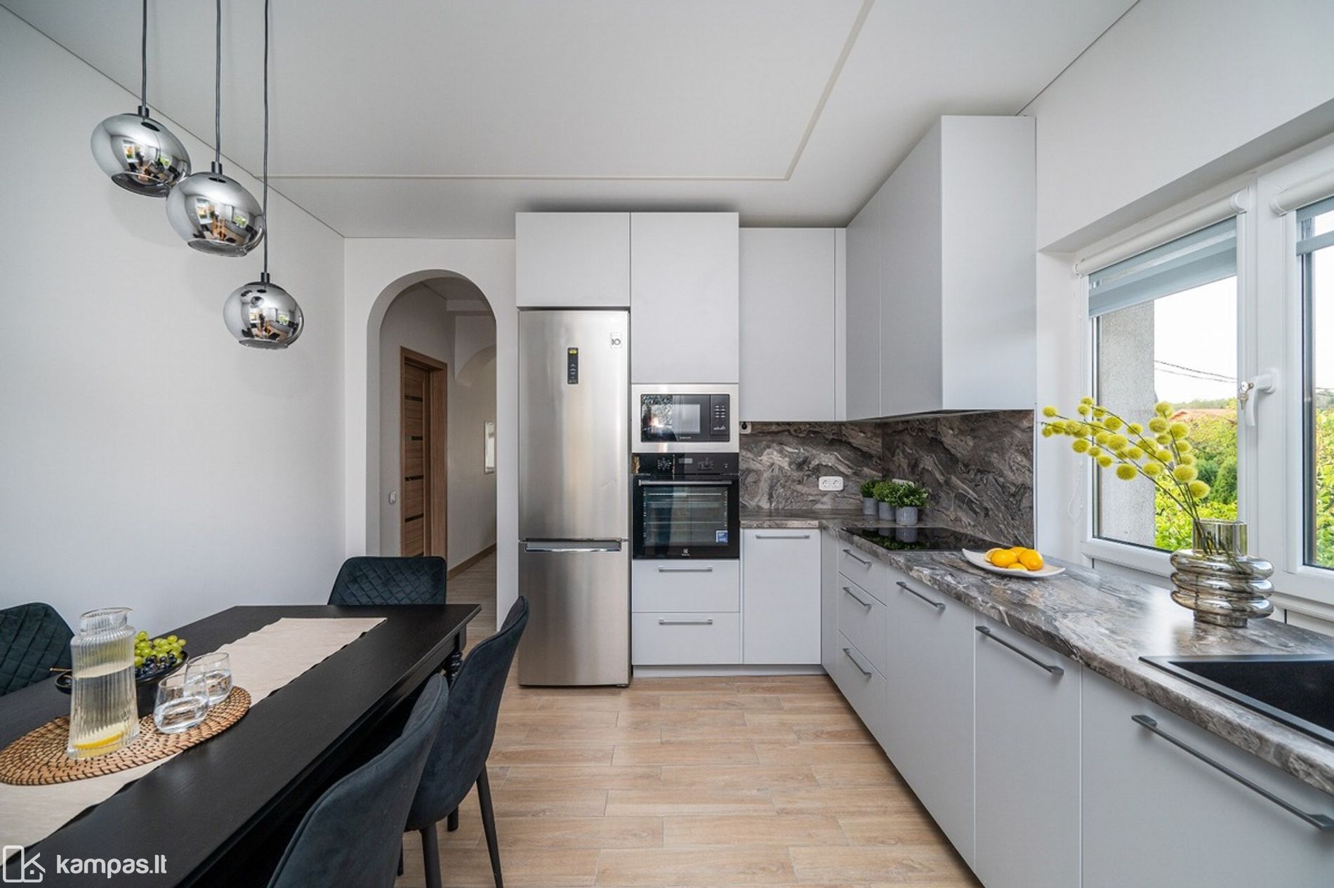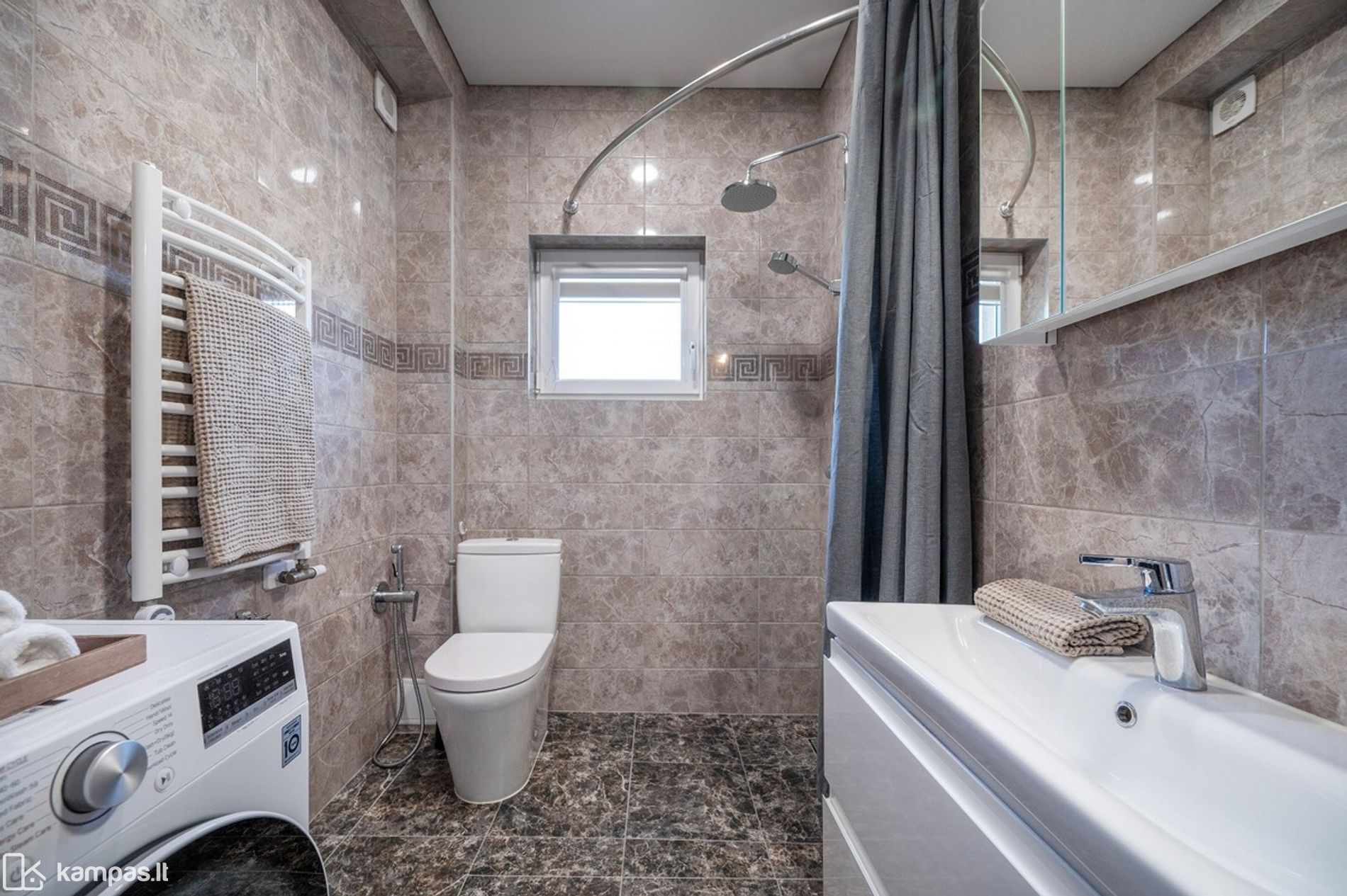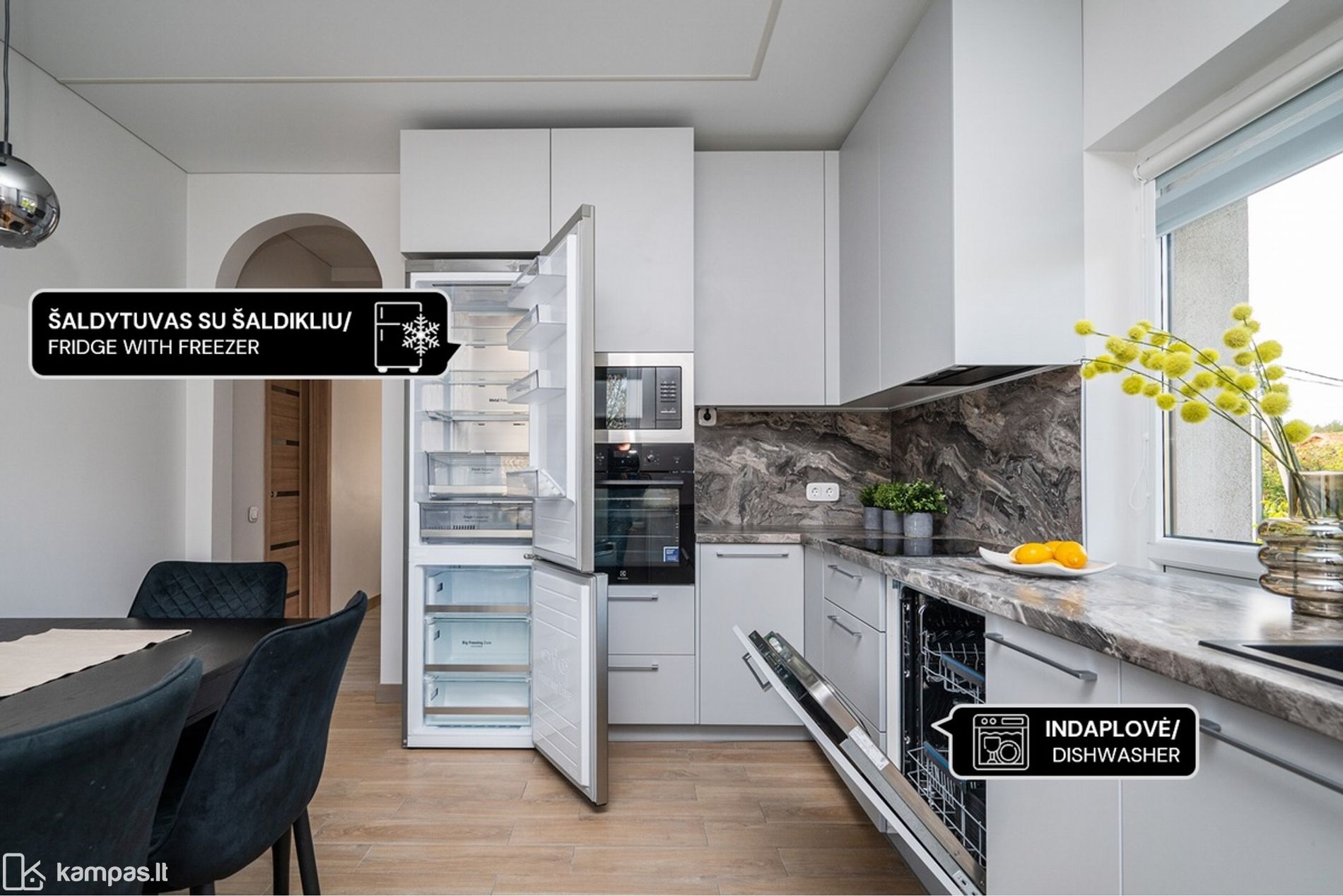 • Nuomojamas su kokybiškais baldais ir buitine technika, matoma nuotraukose (indaplovė, skalbyklė - džiovyklė, šaldytuvas su šaldikliu, gartraukis ir kt.)