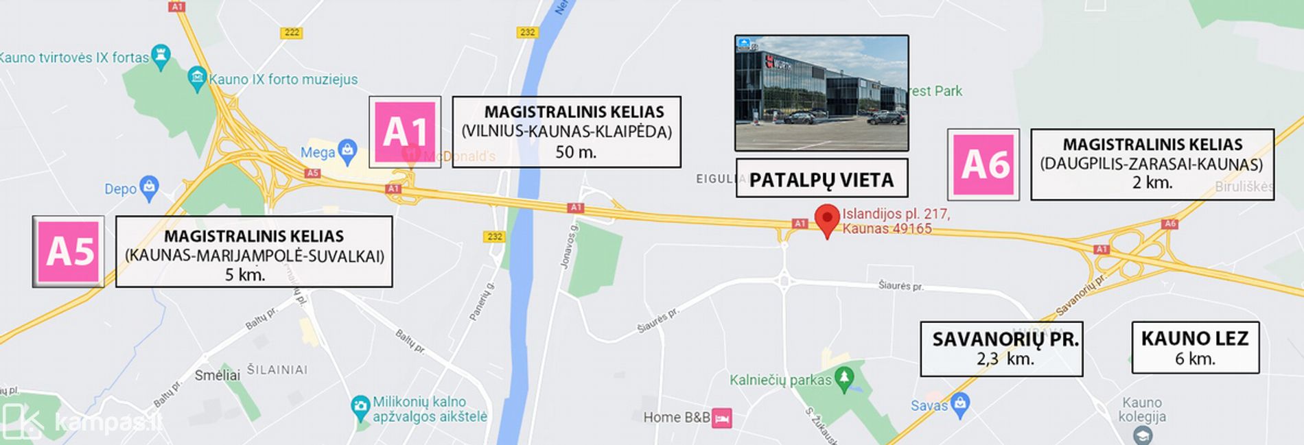 - Itin patogi lokacija: A1 – 50 metrų, A5 – 5 km, A6 – 2 km, Kauno LEZ – 6 km