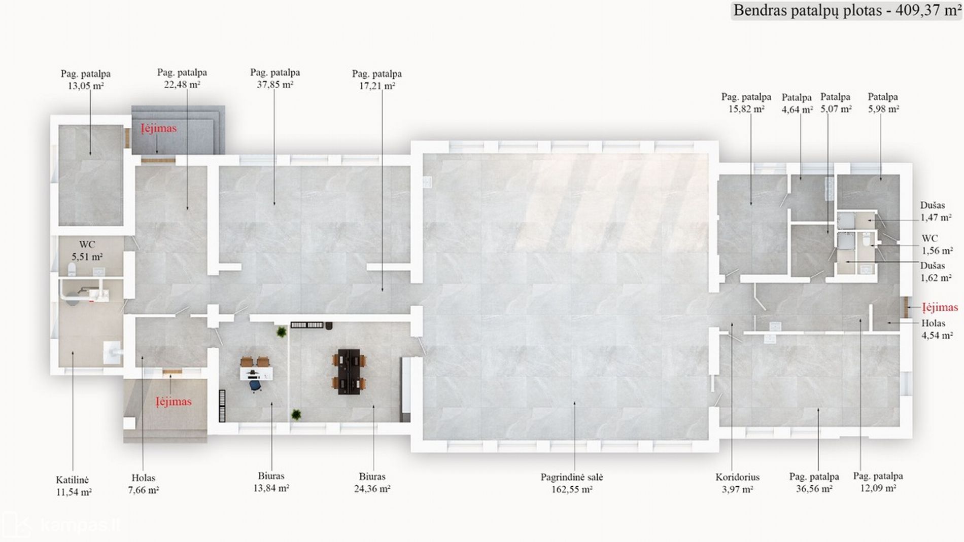 ➢ Pagrindinė salė - 162.55 kv.m., lubų aukštis 4.50 m.