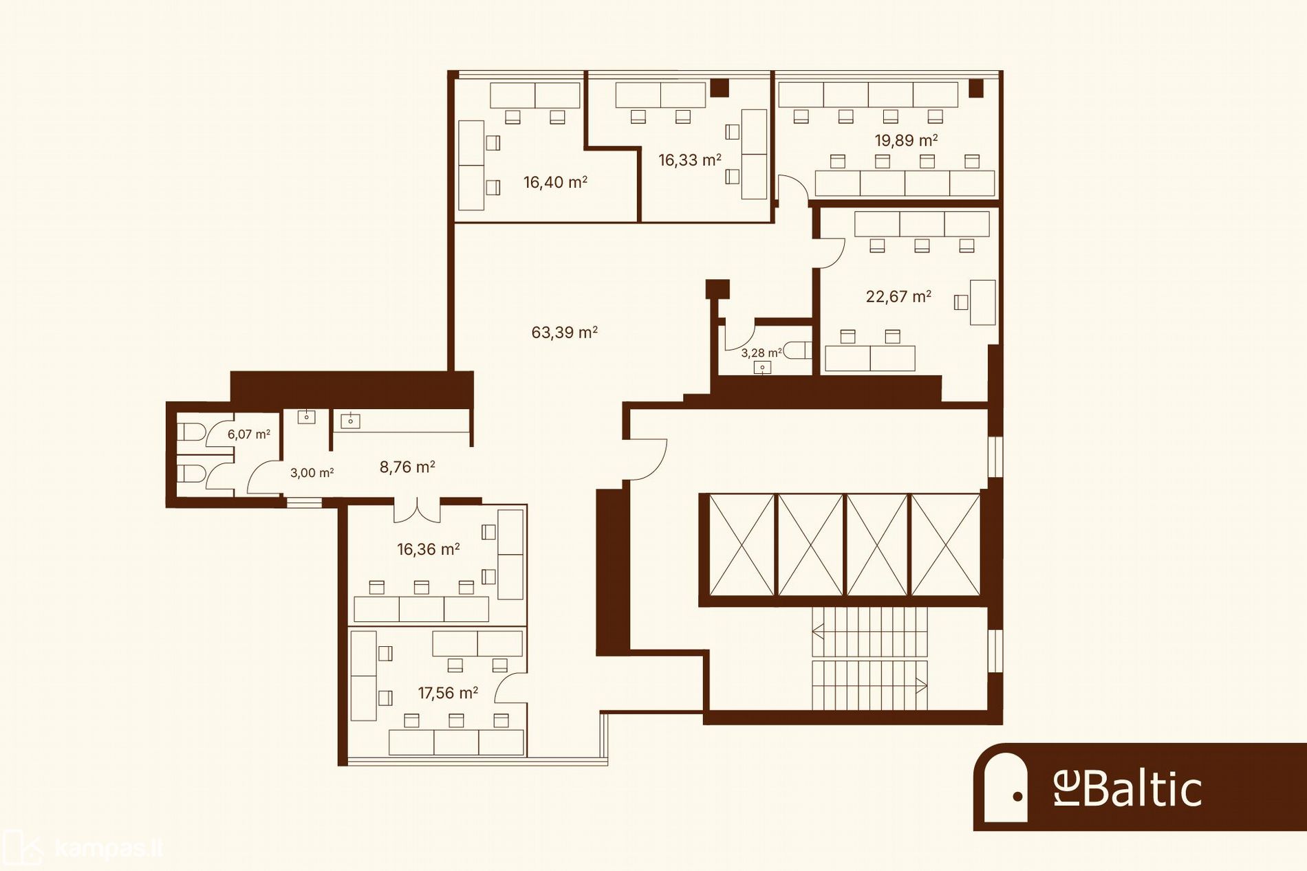 2) 194 sq.m office premises on the 9th floor - price €725,000, currently leased, good return. Lease term until 2029-09-30. Annual rental income €38,900 + VAT, triple net, rent indexation scheduled from 2026.