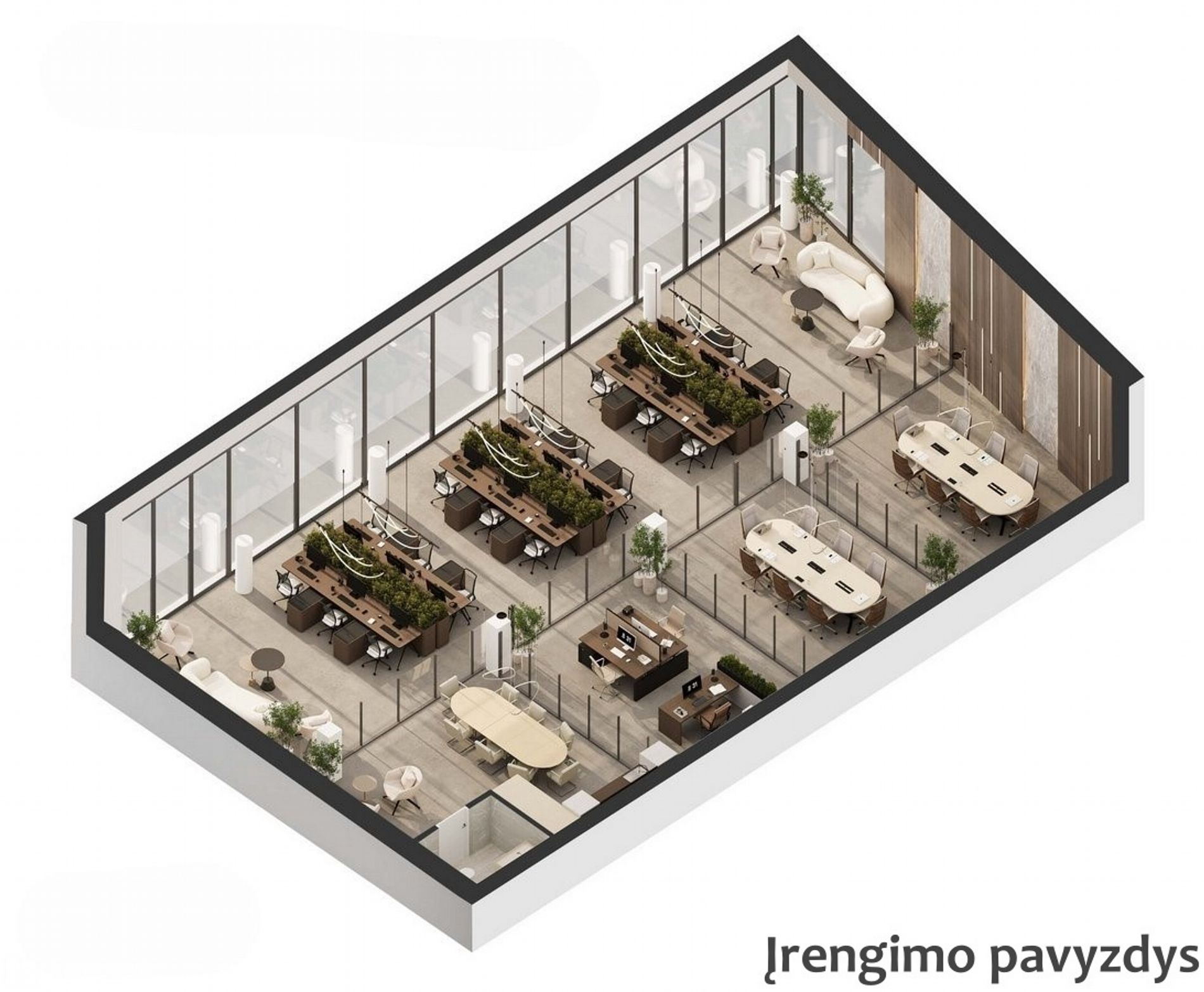 - Dideli vitrininiai langai ir aukštos lubos - erdvės atrodo šviesios ir reprezentatyvios;