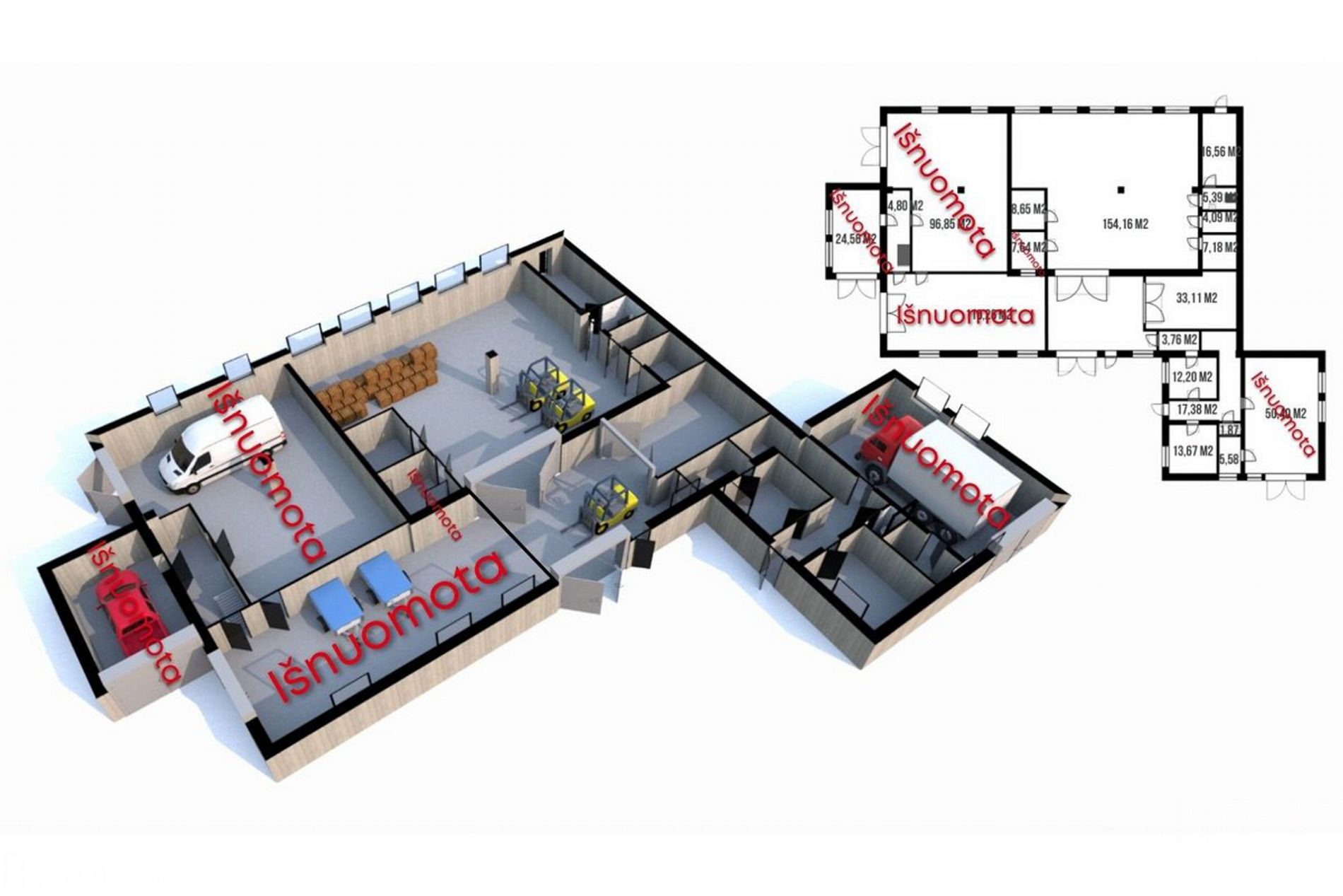 Patalpos patogiai išplanuotos: yra atskiri įėjimai, pirmo aukšto 500.00 kv. m patalpose įrengtos ofiso zonos, persirengimo kambarys, gruntavimo patalpa, auto keltuvas, drenažas, WC patalpa. Antro aukšto (mansardos) patalpose sumontuotas pramoninis keltuvas.