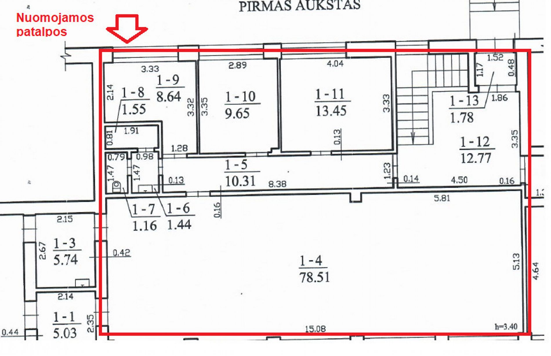 Patalpų kiekis - 4 vnt: 78,51 kv.m, 13,45 kv.m, 9,65 kv.m, 8,64 kv.m, pagalbinė ir wc patalpa.