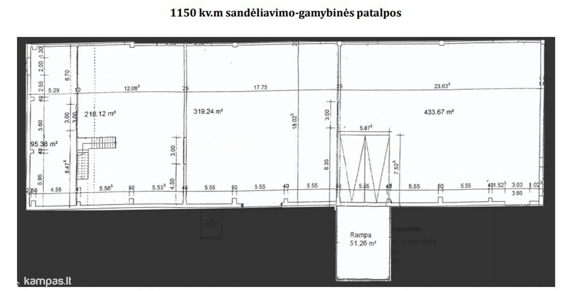 1150 m² sandėlio nuomos kaina-4 Eur/m²+PVM (trys rampos ir dveji pakeliami vartai).