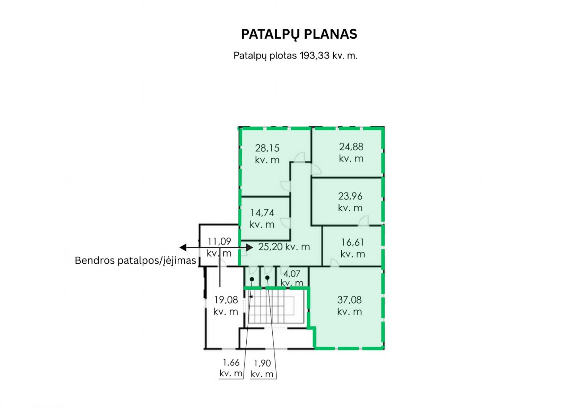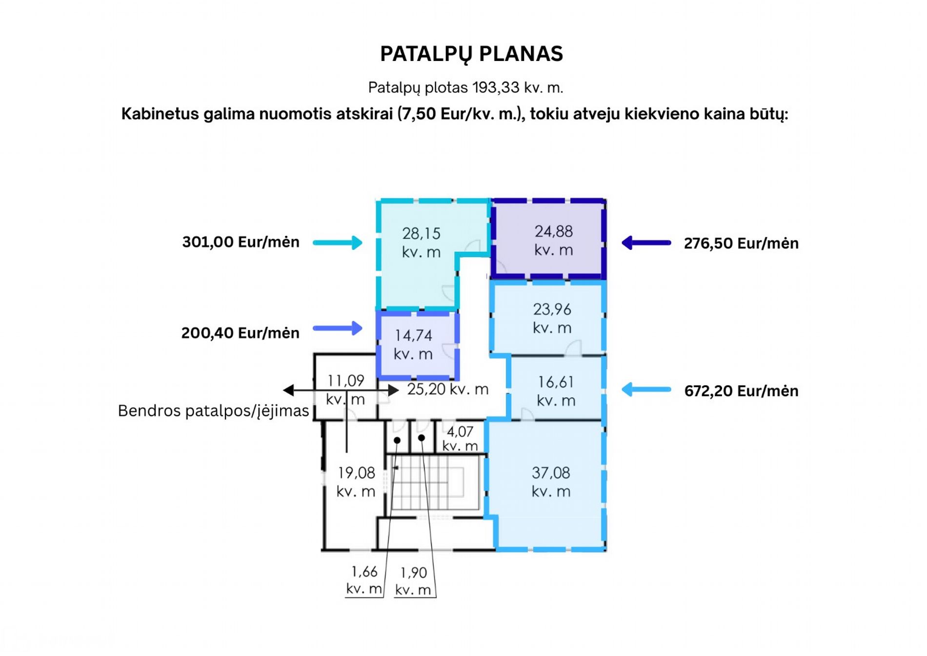 Kabinetus galima nuomotis atskirai (7,50 Eur/kv. m.) arba visas patalpas kartu – tokiu atveju kaina derinama individualiai.