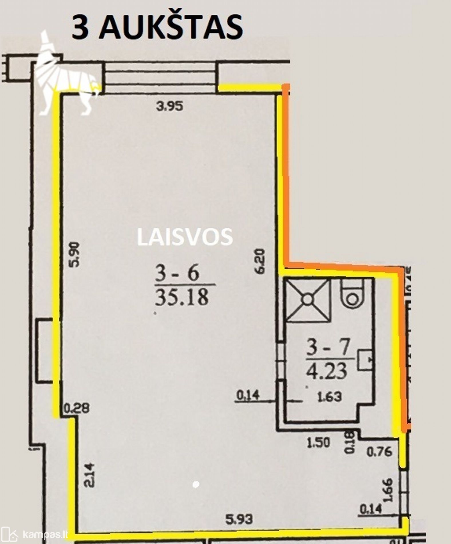 Išnuomojamas tvarkingos ir šviesios 39 kv.m -* biuro patalpos su san mazgu ( WC + dušas).