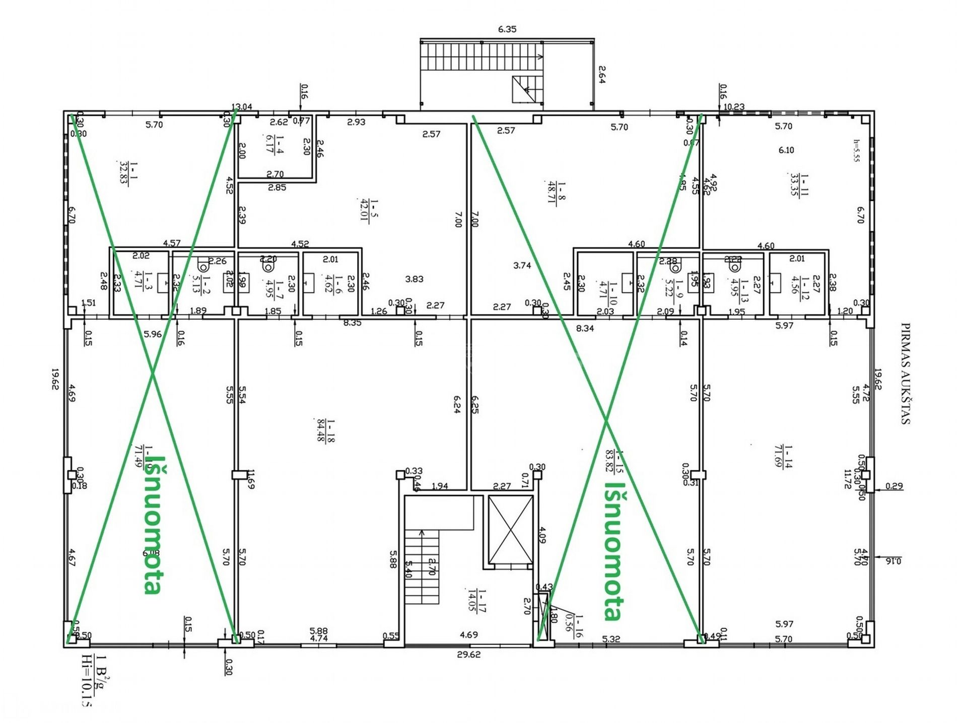 - I aukštas: su dideliais vitrininiais langais, atskirais įėjimais iš fasado pusės bei plačiu įėjimu į sandėliavimui skirtas patalpas. Visų patalpų aukštis – 5,00 m.
