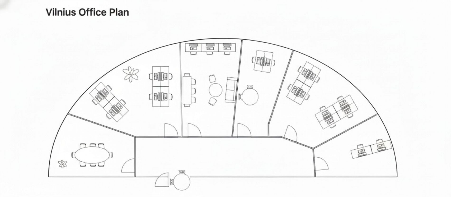 - Biure yra privati virtuvėlė, 6 atskiros zonos, kurios gali būti naudojamos kaip open space erdvė po 8 d.v., 2 susitikimų kambariai, individualūs kabinetai.