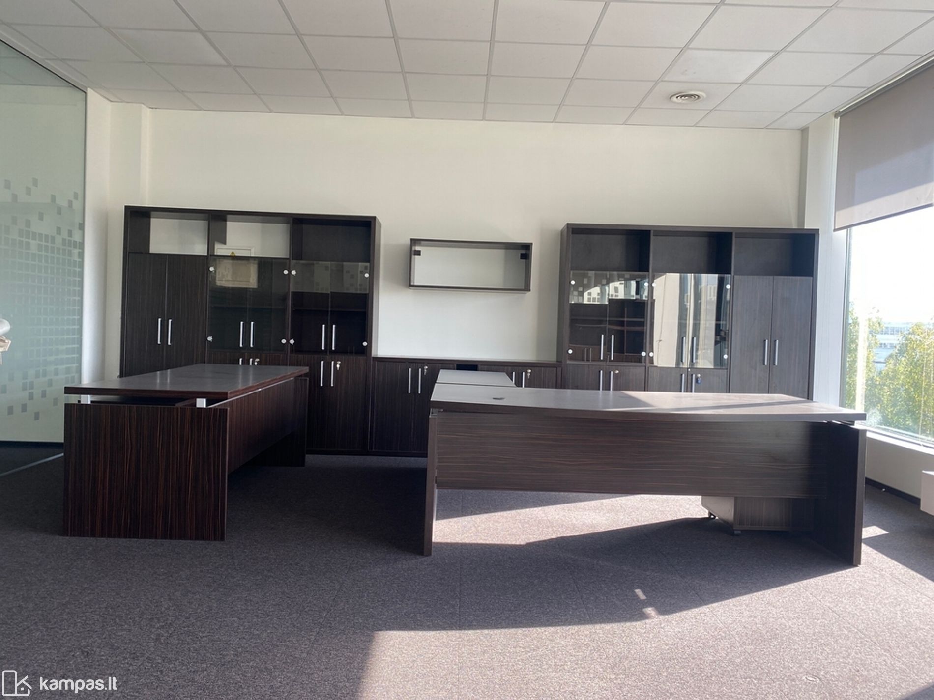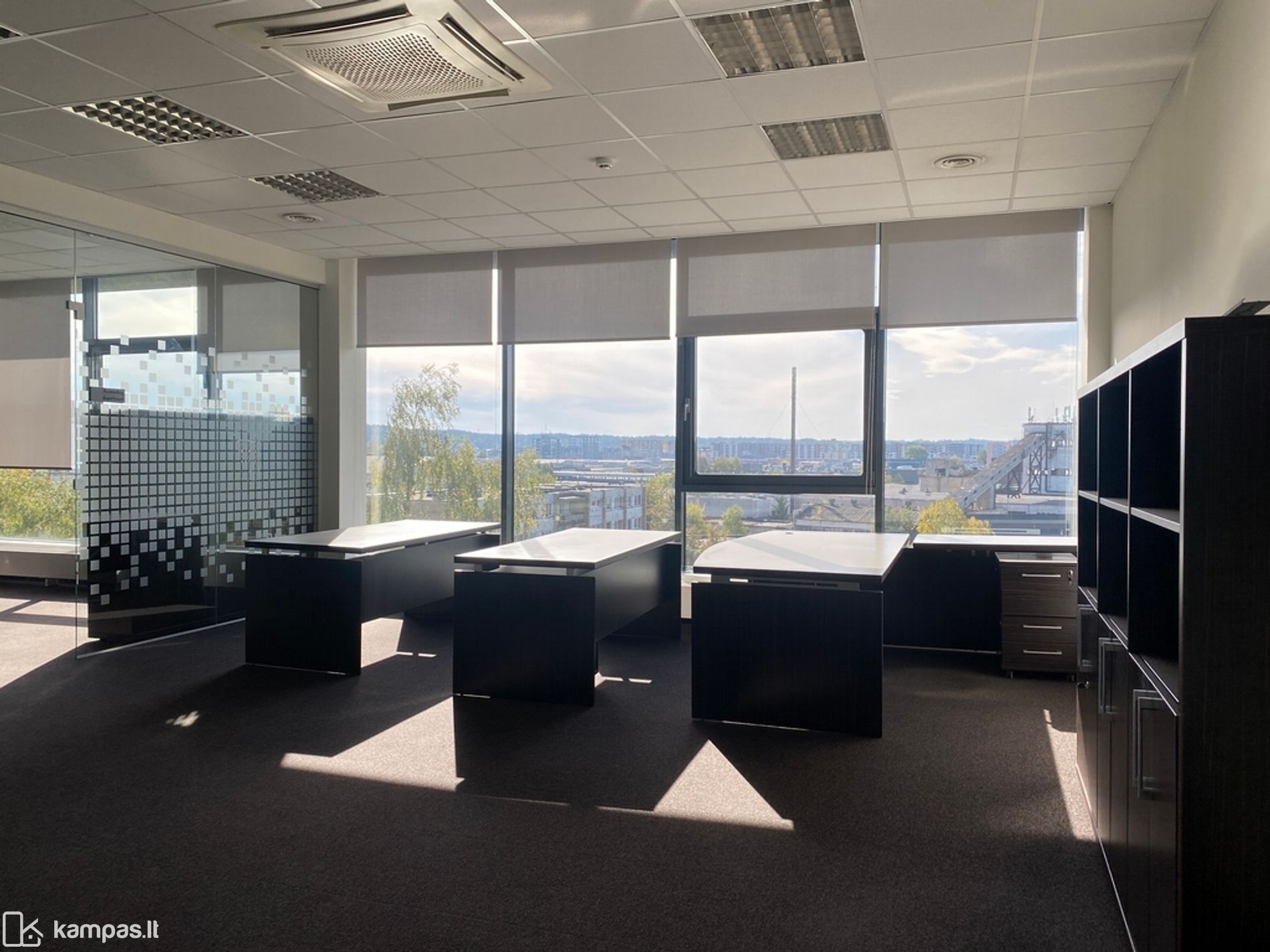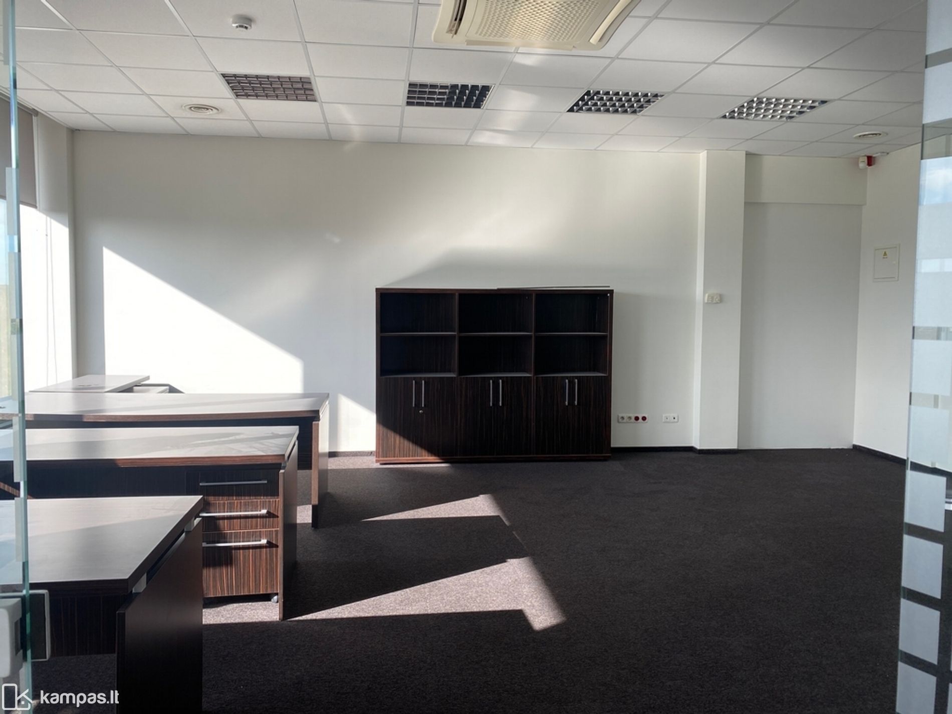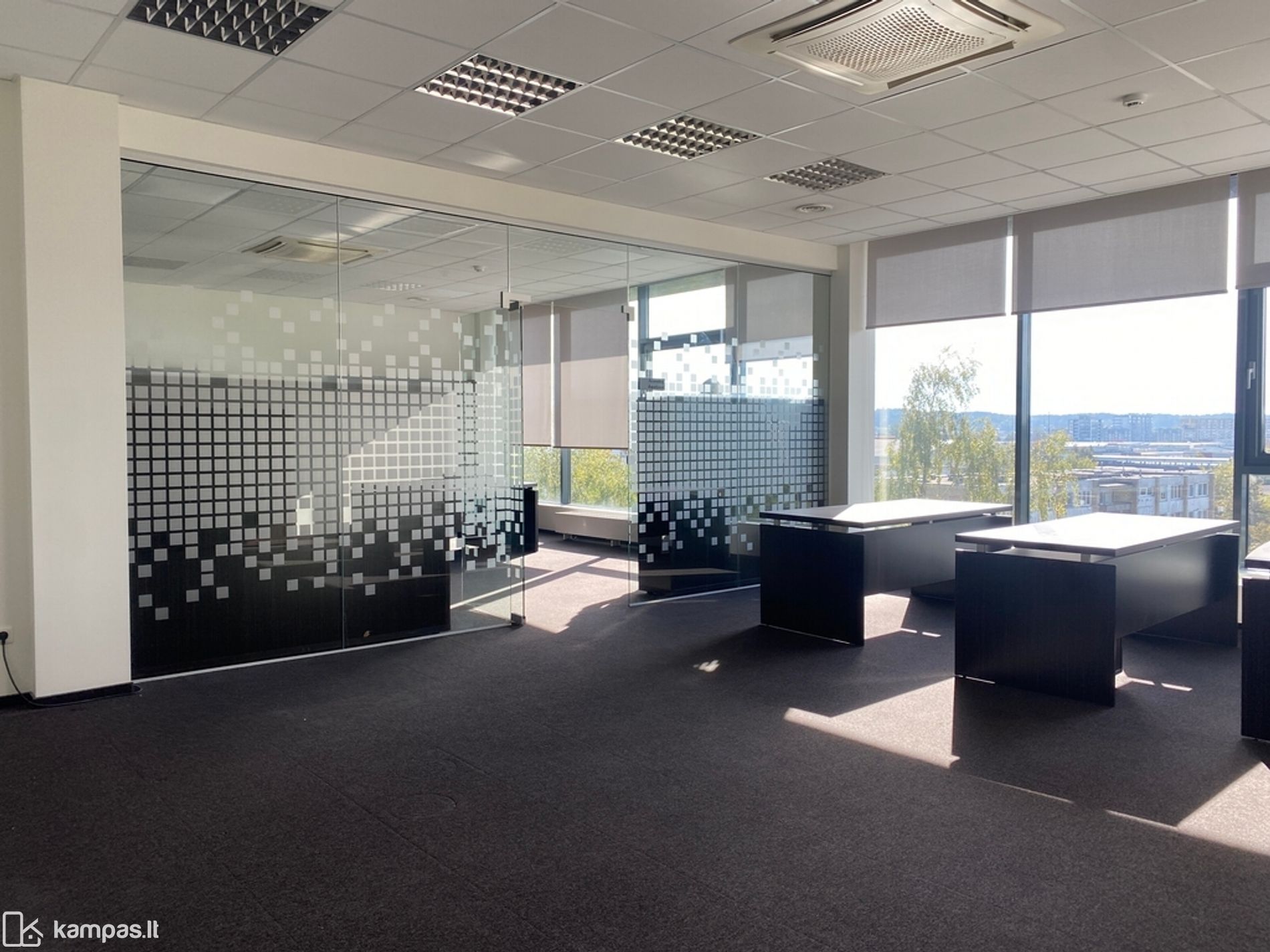 Langai pietų pusėse, kiliminė grindų danga, 3 erdvėsi, stiklo pertvaros, vitrininiai langai, kondicionieriai, rekuperacija, yra baldai nuomos kaina be baldų