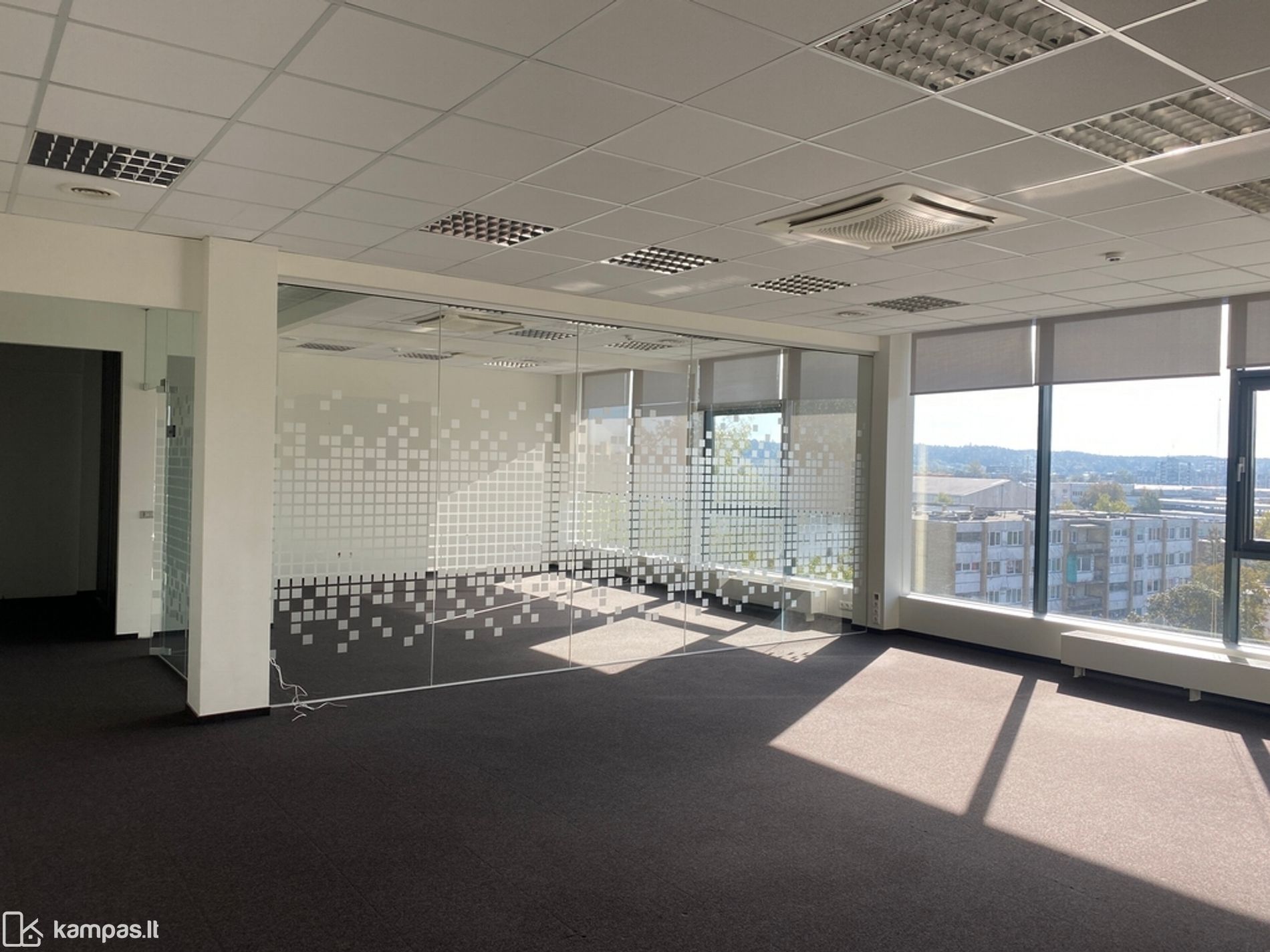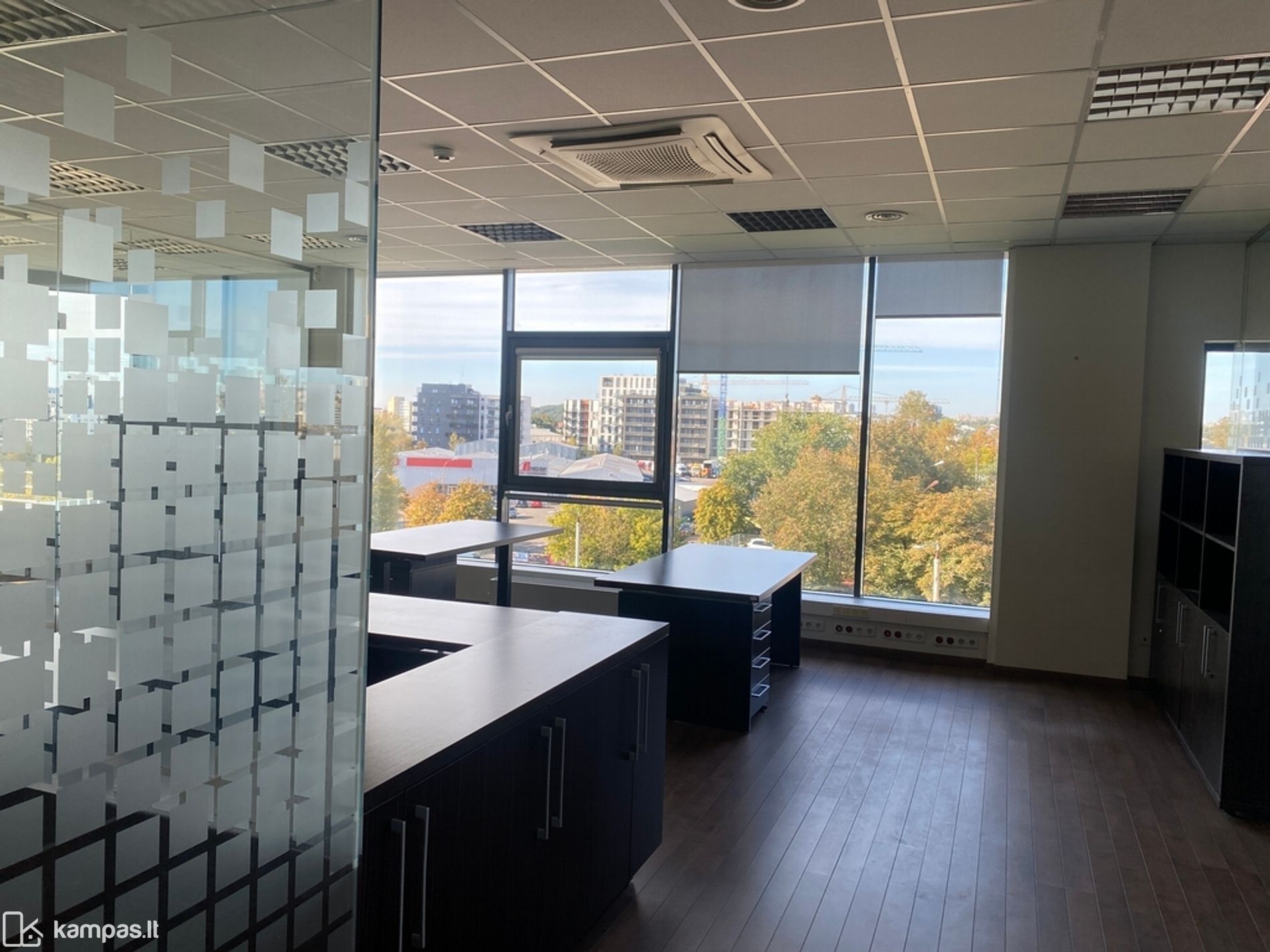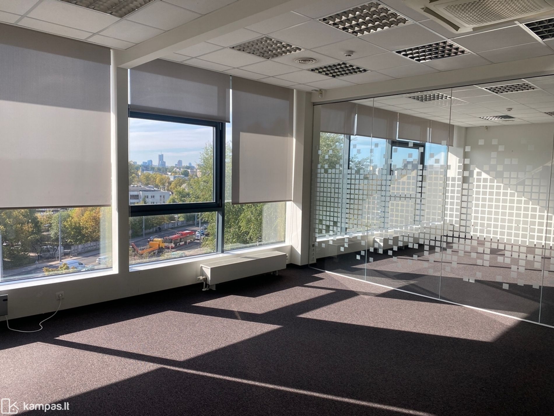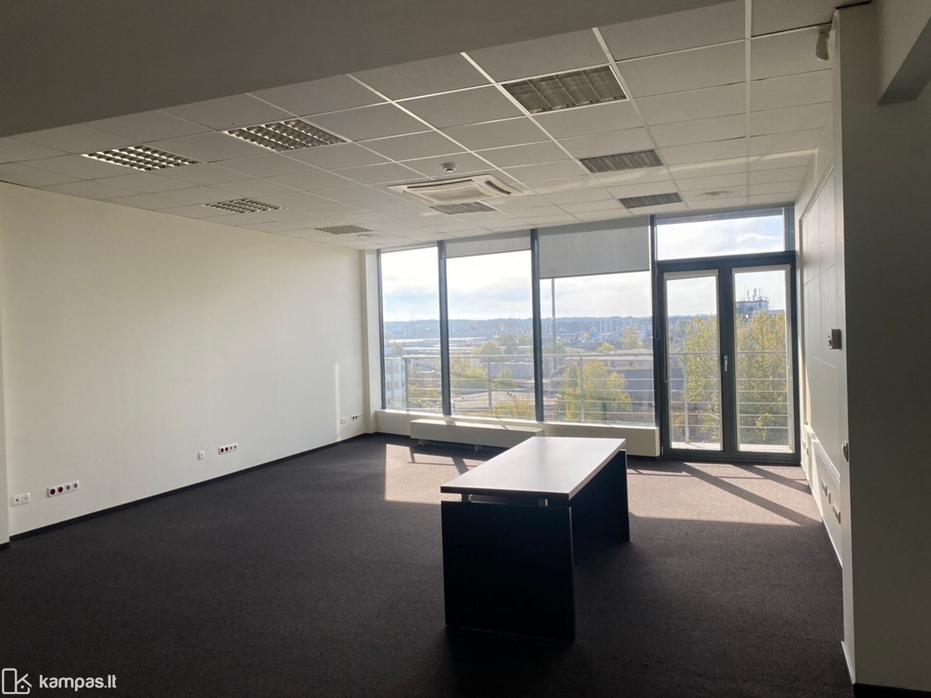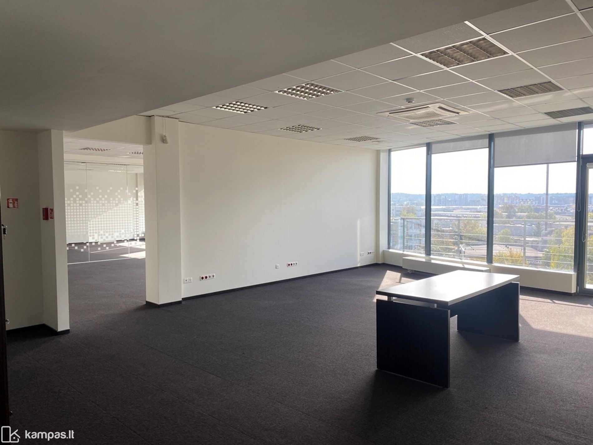 Langai pietų pusėse, kiliminė grindų danga, stiklo pertvaros, vitrininiai langai, kondicionieriai, rekuperacija, yra baldai nuomos kaina be baldų