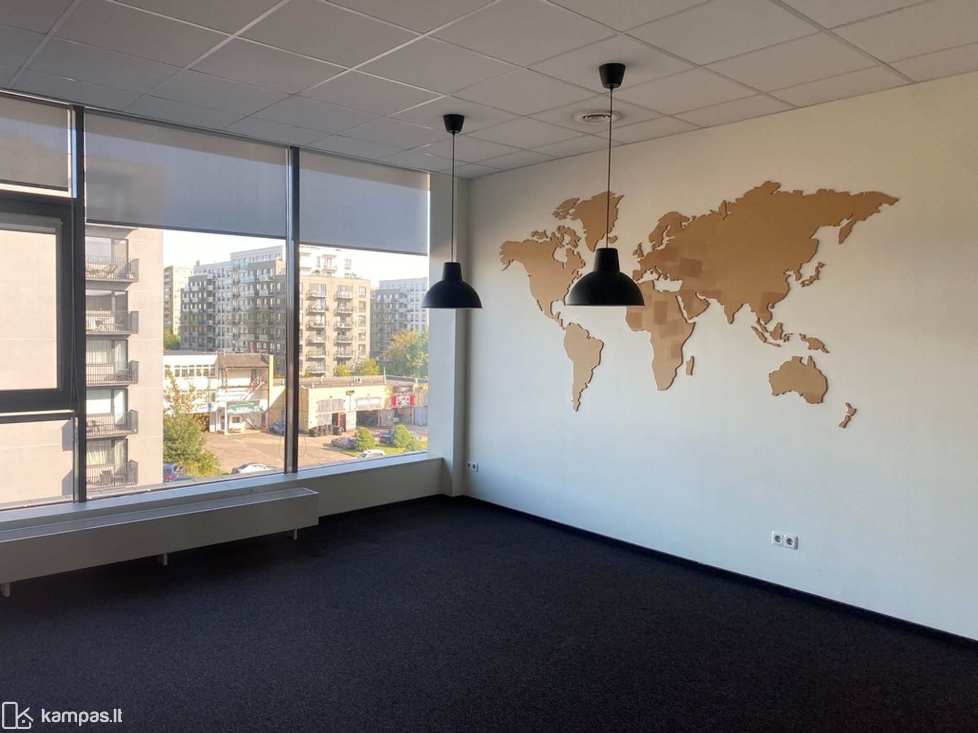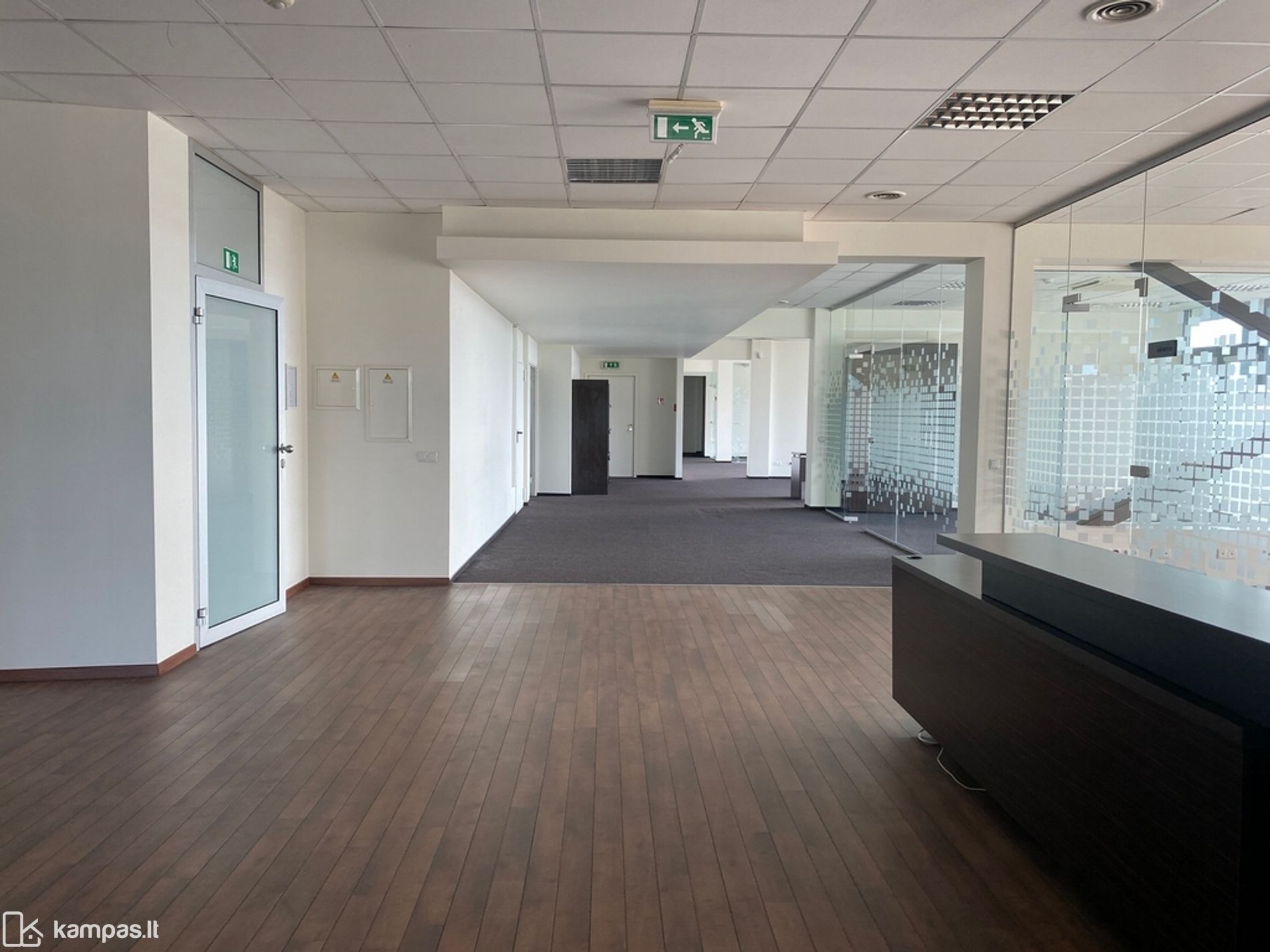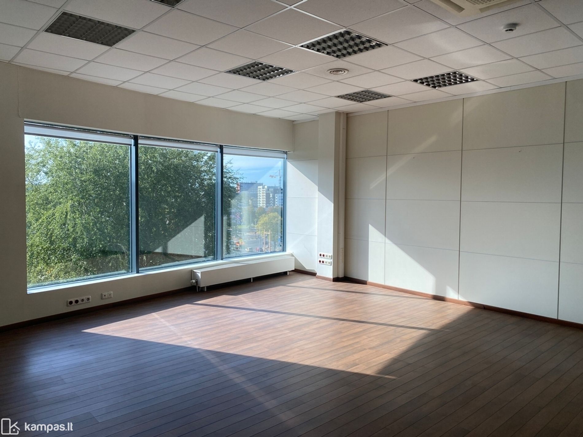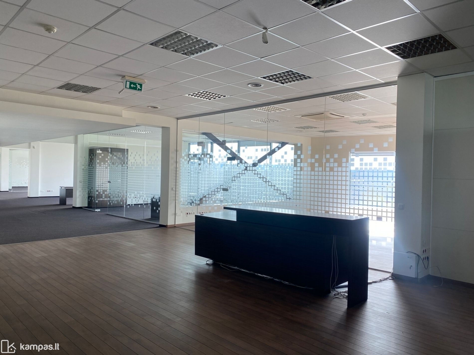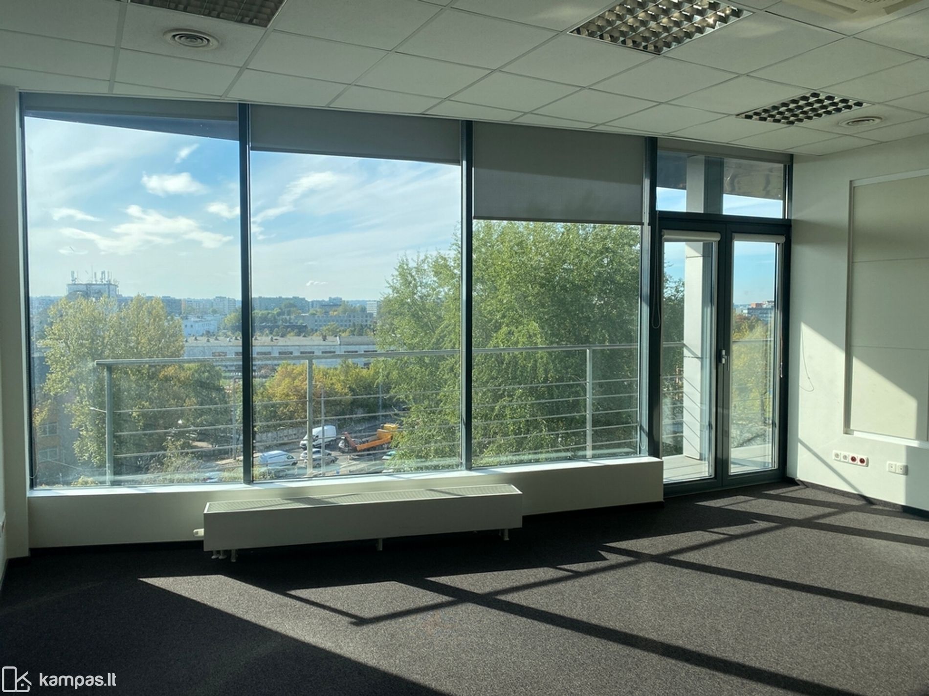 Langai pietų pusėse, kiliminė grindų danga, stiklo pertvaros, vitrininiai langai, kondicionieriai, rekuperacija, yra baldai nuomos kaina be baldų