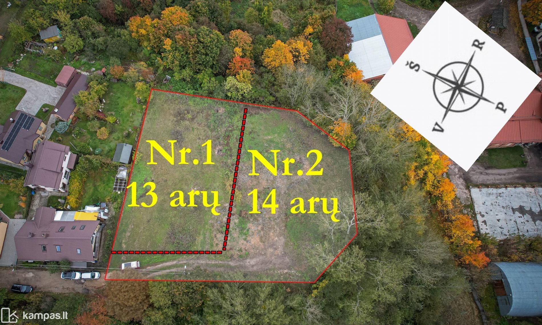 • Sklypo plotas: bendras sklypo plotas - 27,17 a., iš kurių 13 a. parduodame (pažymėtas Nr.1). Vykdomas sklypo padalinimas į dvi dalis.