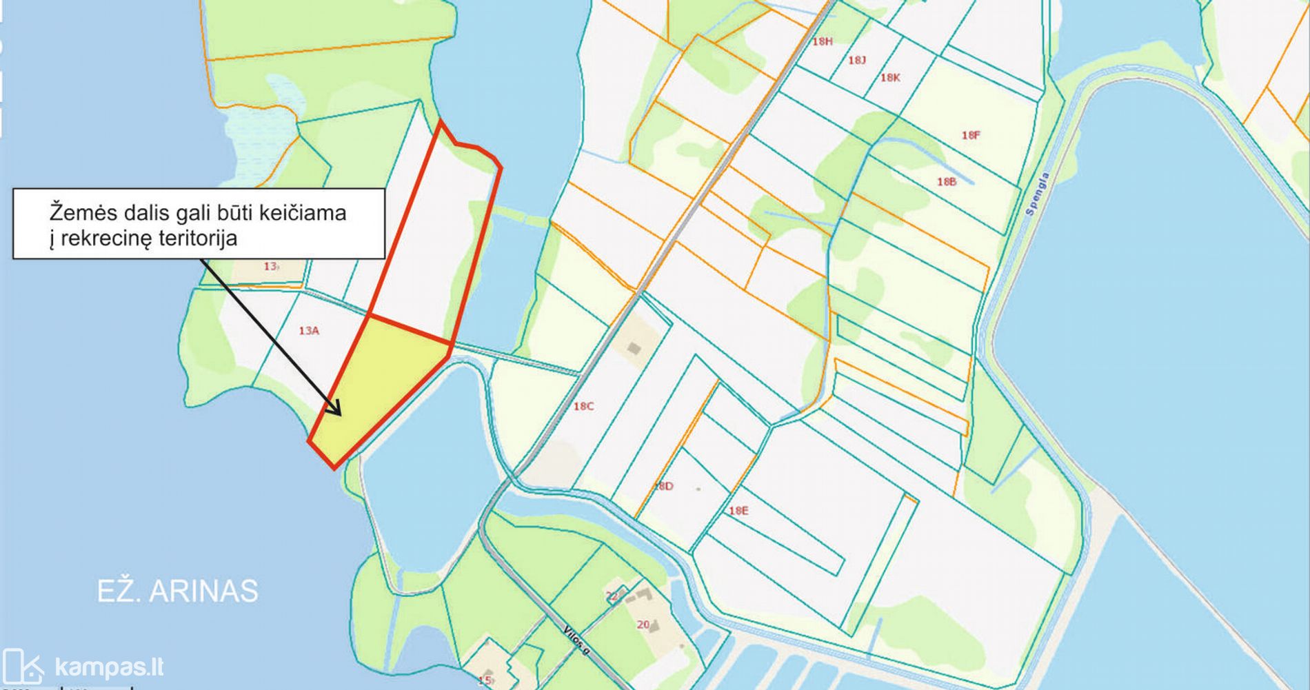 Sklypas patenka į dvi funkcines zonas: žemesnė dalis gali būti keičiama į rekreacinę teritoriją. Atlikus kadastrinius matavimus, sklypą galima padalinti į du, kuriuos skiria viešasis kelias.