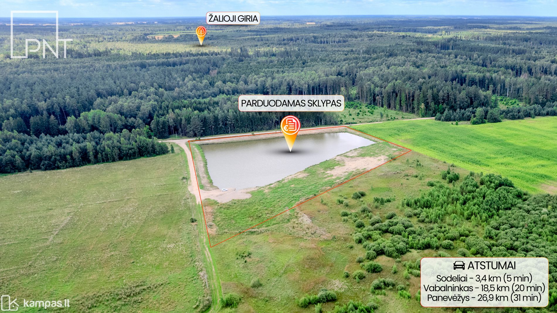 Panevėžio rajone, greta Sodelių ir Puzinų kaimų, apie 20 km nuo Panevėžio miesto, parduodamas unikalus sklypas su dideliu vandens telkiniu.