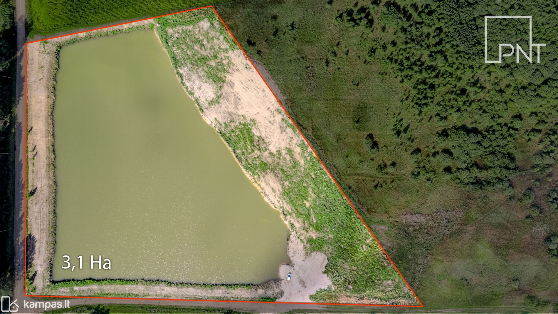 Maždaug 3 ha plote yra suformuotas vandens telkinys – tai buvusio žvyro/smėlio karjero vieta, kuri šiandien virsta puikia poilsio ir rekreacijos zona. Greta tvenkinio galima suformuoti kelis rekreacinės paskirties sklypus su poilsiniais nameliais turistams ar poilsiautojams.