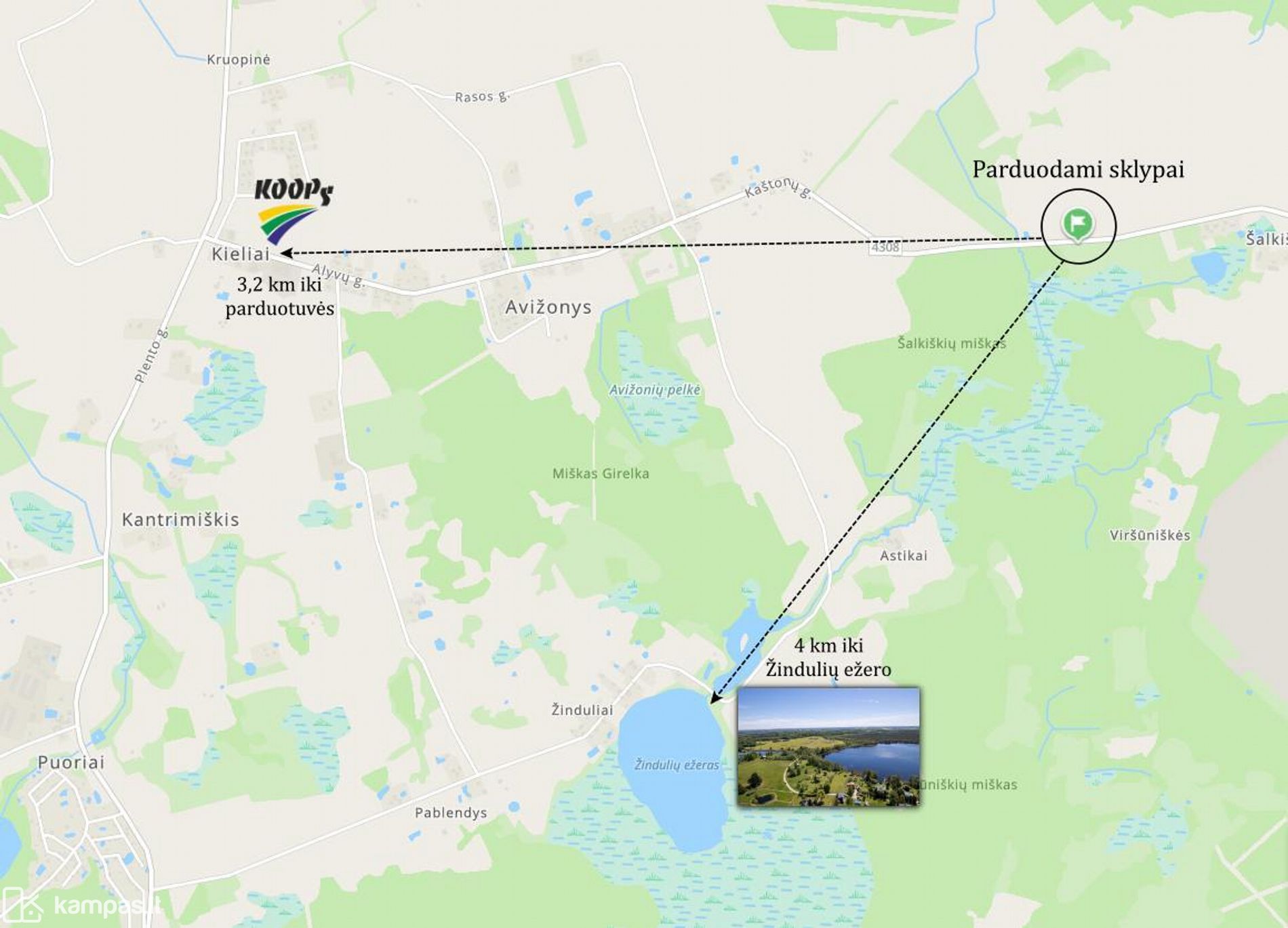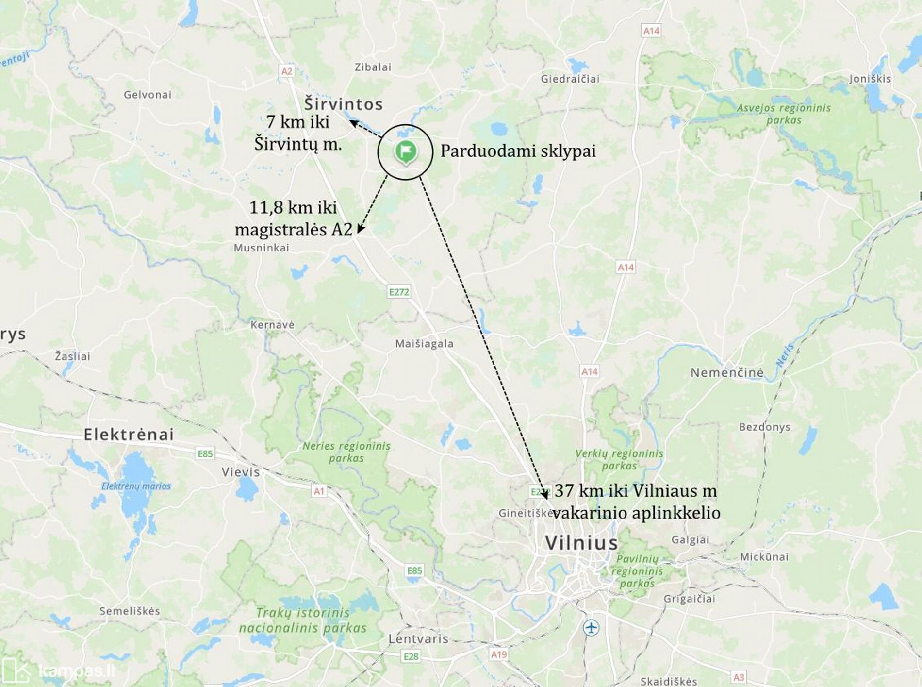 Nors aplink vyrauja gamta, šie sklypai yra strategiškai patogioje vietoje. 720 metrų nuo sklypų yra elektros transformatorinė, o iki asfaltuotos gatvės – tik 1 kilometras. Iki artimiausios KOOPS parduotuvės – 3,2 km, iki Žindulių ežero – vos 4 km, tad maudynės ar žvejyba visai šalia. Iki Širvintų miesto centro – 7 km, kur rasite mokyklas, darželius, kavines bei visą reikiamą infrastruktūrą, o iki magistralės A2 – 11,8 km, todėl sostinę pasieksite vos per 30 minučių, nes iki Vilniaus vakarinio aplinkkelio tėra 37 kilometrai.