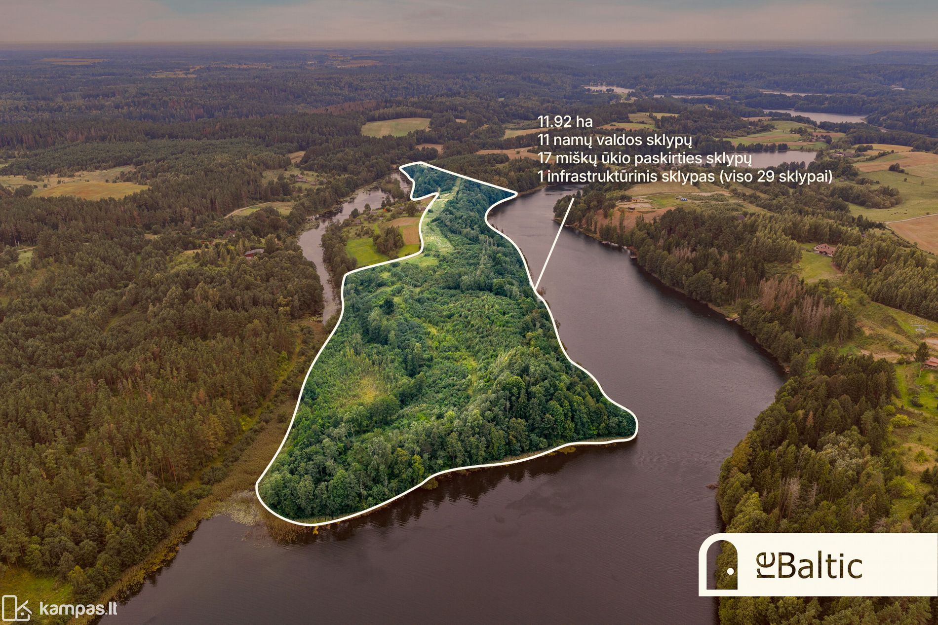 Unikalus 11 gyvenamųjų sklypų masyvas Ilgių ežero pusiasalyje su 17 miško sklypų ir infrastruktūriniu sklypu