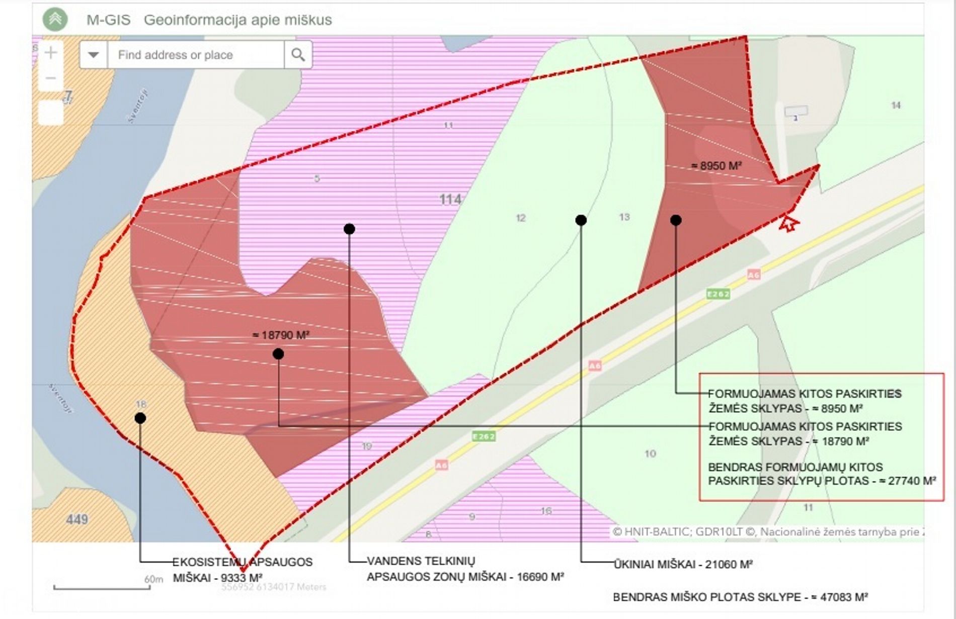 - ESAMA PASKIRTIS – miškų ūkio. Šiuo metu rengiamas sklypo formavimo ir pertvarkymo projektas, suskirstant į 3 sklypus. Numatomos paskirtys: