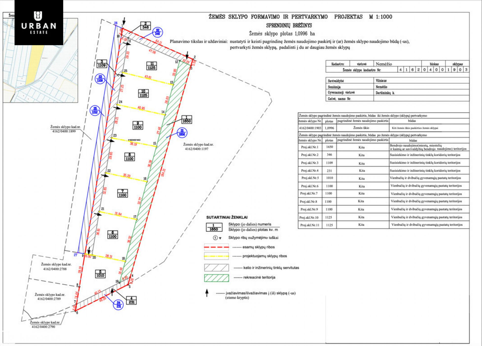 • Sklypų plotai - nuo 10,10 a iki 11,25 a + žalioji zona + infrastruktūros bei susisiekimo paskirties sklypai;