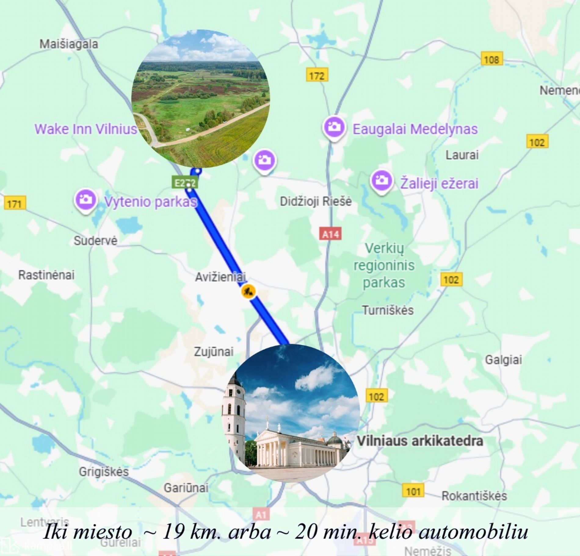 • Vilniaus miesto centrinė dalis – ~ 19 km (~ 20 min. automobiliu);