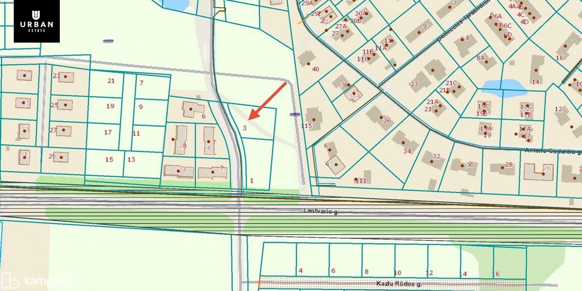 • Sklypą nuo Lentvario gatvės skiria brandžių medžių linija ir priešais esantis sklypas.