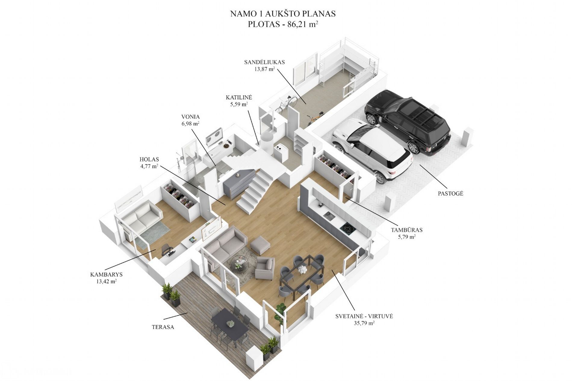 • Išorės apdaila: fasadų - šviesiai pilkas tinkas, stogo – tamsiai pilkos spalvos volcuota skarda;